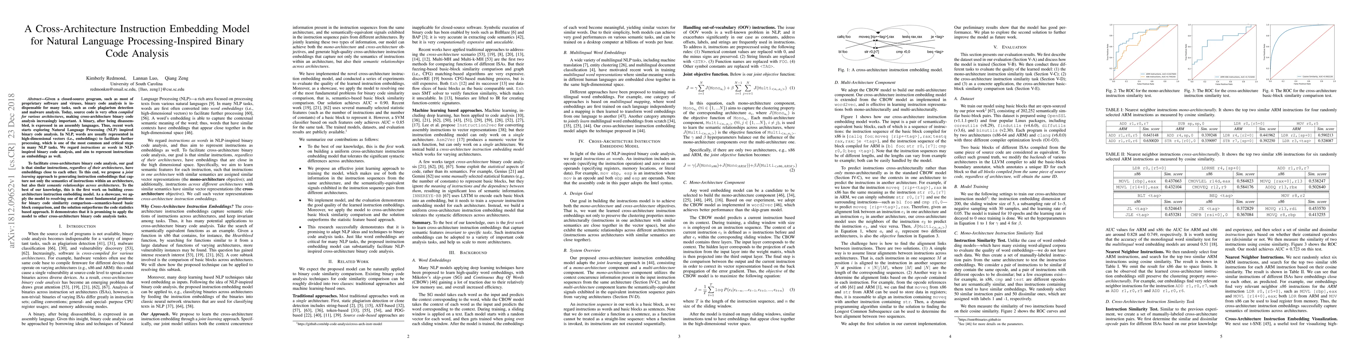 This paper proposes a cross-architecture instruction embedding model for binary code analysis, aiming to represent similar instructions across different architectures with similar embeddings. The model demonstrates improved performance in semantics-based basic block comparison over traditional code statistics-based methods.