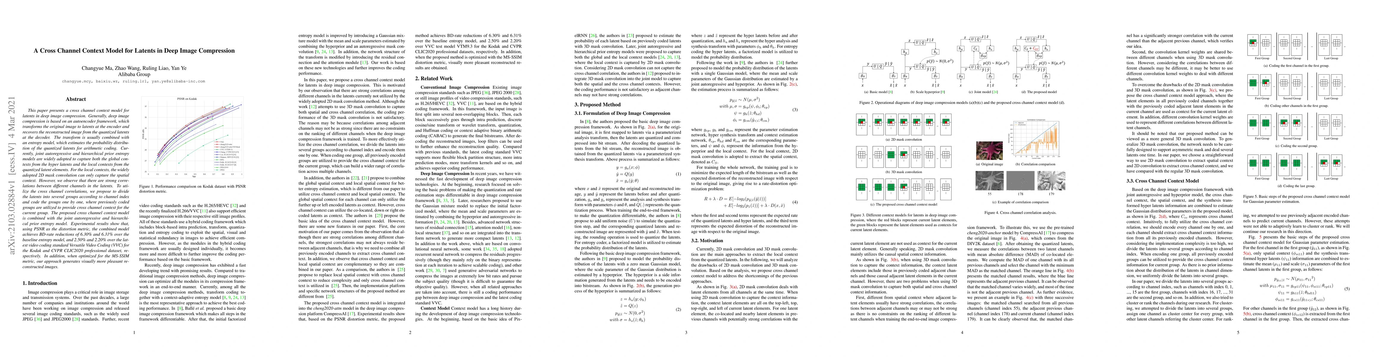 This paper proposes a cross channel context model for latents in deep image compression, utilizing correlations between different channels to enhance entropy modeling. The model achieves significant BD-rate reductions compared to baseline and latest video coding standards, and generates visually more pleasant reconstructed images.