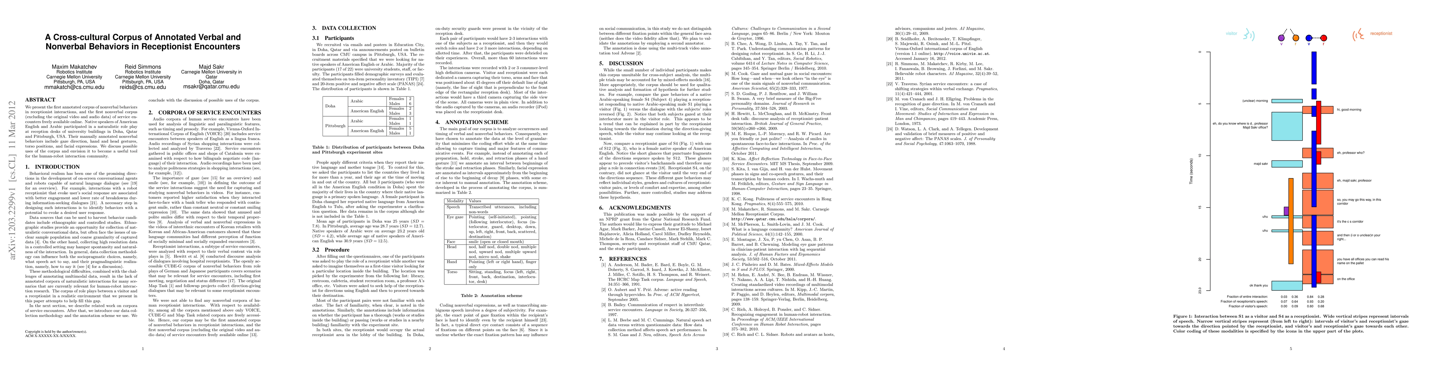 We present the first annotated corpus of nonverbal behaviors in receptionist interactions, and the first nonverbal corpus (excluding the original video and audio data) of service encounters freely available online. Native speakers of American English and Arabic participated in a naturalistic role play at reception desks of university buildings in Doha, Qatar and Pittsburgh, USA. Their manually annotated nonverbal behaviors include gaze direction, hand and head gestures, torso positions, and facial expressions. We discuss possible uses of the corpus and envision it to become a useful tool for the human-robot interaction community.