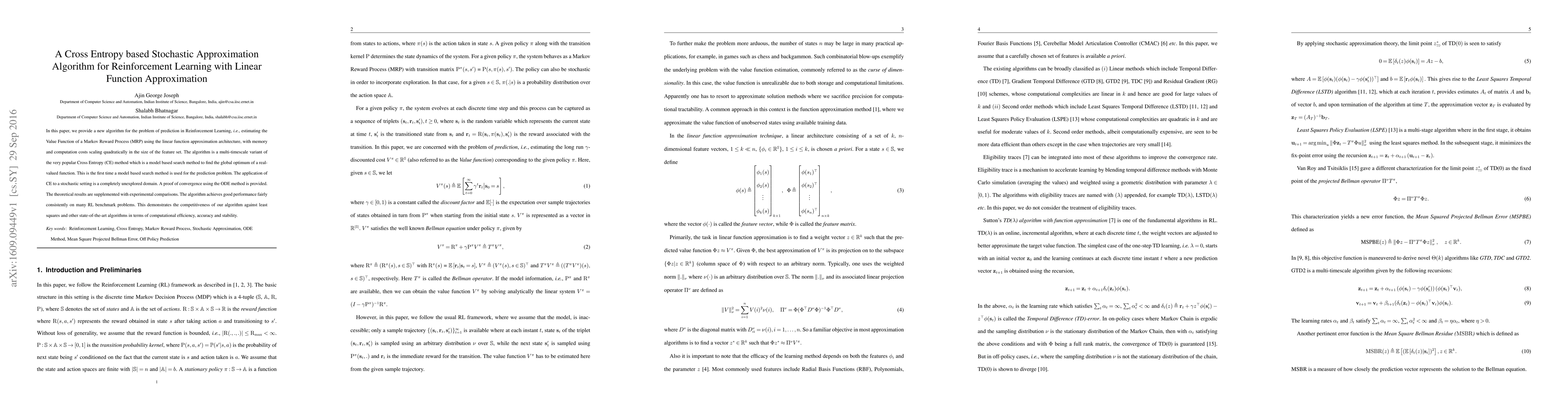 This paper introduces a novel Cross Entropy based stochastic approximation algorithm for reinforcement learning, specifically for estimating the Value Function using linear function approximation. The proposed multi-timescale variant of the Cross Entropy method demonstrates competitive performance against state-of-the-art algorithms in terms of efficiency, accuracy, and stability, supported by theoretical convergence proofs and empirical results.