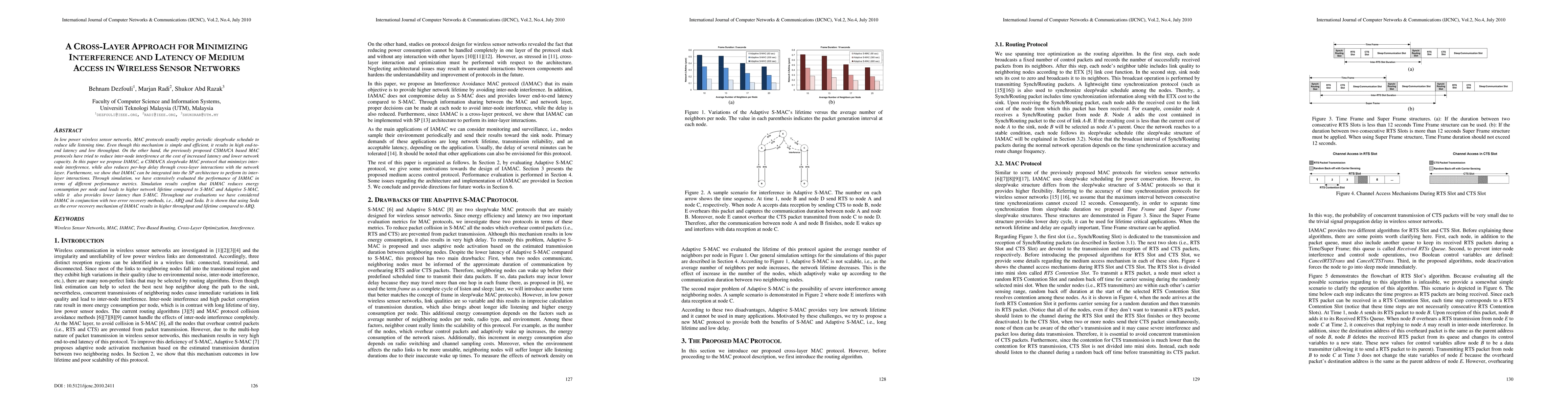 In low power wireless sensor networks, MAC protocols usually employ periodic sleep/wake schedule to reduce idle listening time. Even though this mechanism is simple and efficient, it results in high end-to-end latency and low throughput. On the other hand, the previously proposed CSMA/CA-based MAC protocols have tried to reduce inter-node interference at the cost of increased latency and lower network capacity. In this paper we propose IAMAC, a CSMA/CA sleep/wake MAC protocol that minimizes inter-node interference, while also reduces per-hop delay through cross-layer interactions with the network layer. Furthermore, we show that IAMAC can be integrated into the SP architecture to perform its inter-layer interactions. Through simulation, we have extensively evaluated the performance of IAMAC in terms of different performance metrics. Simulation results confirm that IAMAC reduces energy consumption per node and leads to higher network lifetime compared to S-MAC and Adaptive S-MAC, while it also provides lower latency than S-MAC. Throughout our evaluations we have considered IAMAC in conjunction with two error recovery methods, i.e., ARQ and Seda. It is shown that using Seda as the error recovery mechanism of IAMAC results in higher throughput and lifetime compared to ARQ.