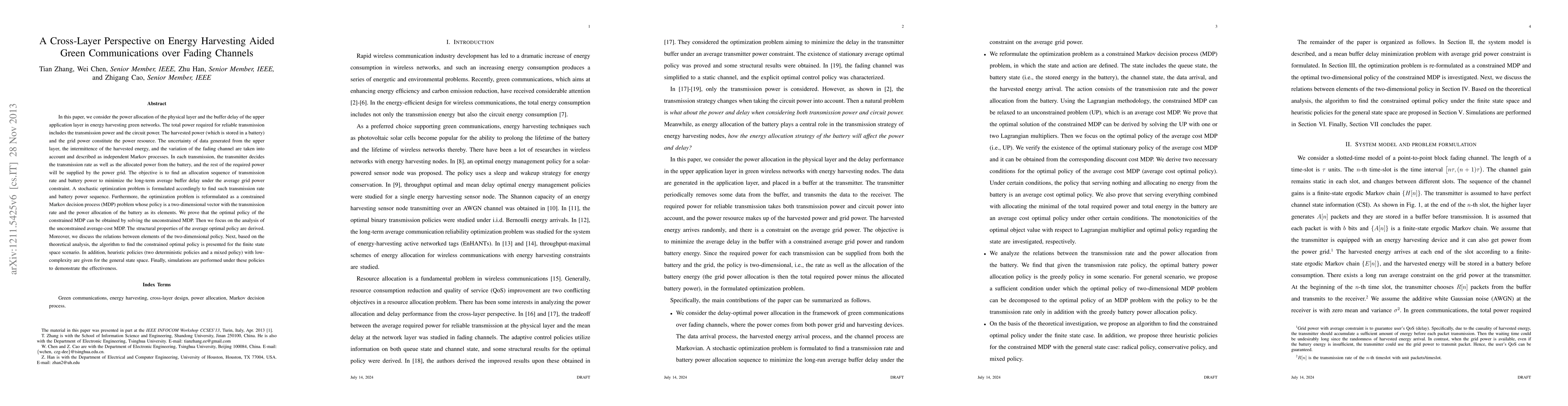 This research proposes a cross-layer approach for power allocation in energy harvesting green communication networks, considering both physical and application layers. It models uncertainties and intermittencies as Markov processes and formulates an optimization problem to minimize long-term average buffer delay under grid power constraints. The problem is reformulated as a constrained Markov Decision Process (MDP), proven solvable via an unconstrained MDP. Structural properties of the average optimal policy are derived, and algorithms for finite and general state spaces are provided. Simulation results validate the effectiveness of the proposed policies.