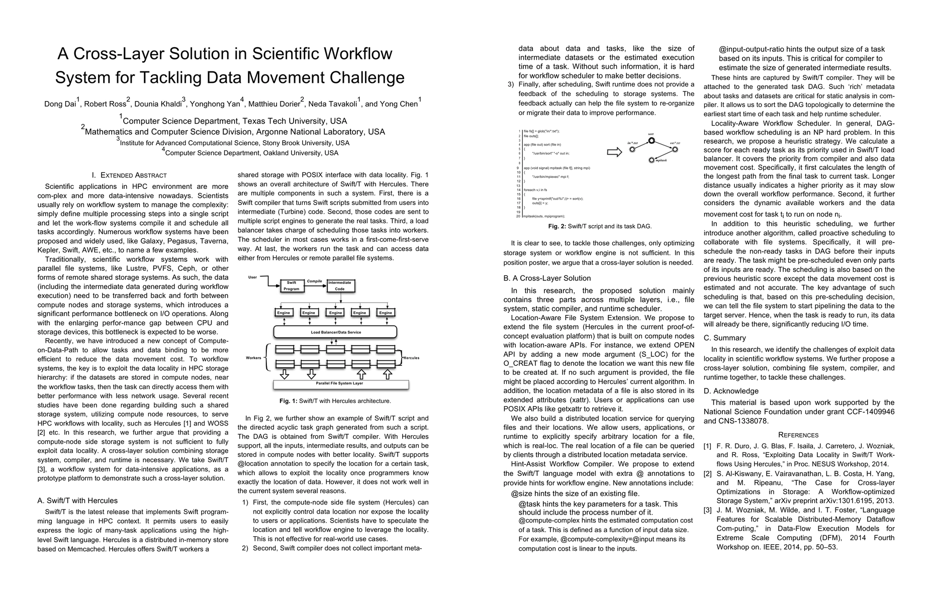Scientific applications in HPC environment are more com-plex and more data-intensive nowadays. Scientists usually rely on workflow system to manage the complexity: simply define multiple processing steps into a single script and let the work-flow systems compile it and schedule all tasks accordingly. Numerous workflow systems have been proposed and widely used, like Galaxy, Pegasus, Taverna, Kepler, Swift, AWE, etc., to name a few examples. Traditionally, scientific workflow systems work with parallel file systems, like Lustre, PVFS, Ceph, or other forms of remote shared storage systems. As such, the data (including the intermediate data generated during workflow execution) need to be transferred back and forth between compute nodes and storage systems, which introduces a significant performance bottleneck on I/O operations. Along with the enlarging perfor-mance gap between CPU and storage devices, this bottleneck is expected to be worse. Recently, we have introduced a new concept of Compute-on-Data-Path to allow tasks and data binding to be more efficient to reduce the data movement cost. To workflow systems, the key is to exploit the data locality in HPC storage hierarchy: if the datasets are stored in compute nodes, near the workflow tasks, then the task can directly access them with better performance with less network usage. Several recent studies have been done regarding building such a shared storage system, utilizing compute node resources, to serve HPC workflows with locality, such as Hercules [1] and WOSS [2] etc. In this research, we further argue that providing a compute-node side storage system is not sufficient to fully exploit data locality. A cross-layer solution combining storage system, compiler, and runtime is necessary. We take Swift/T [3], a workflow system for data-intensive applications, as a prototype platform to demonstrate such a cross-layer solution