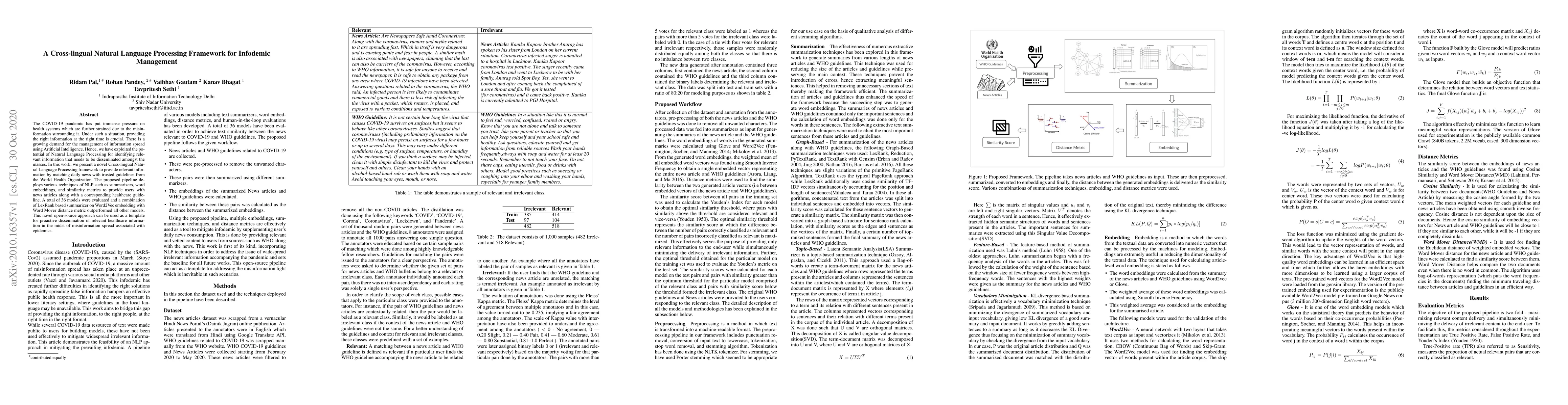 The COVID-19 pandemic has put immense pressure on health systems which are further strained due to the misinformation surrounding it. Under such a situation, providing the right information at the right time is crucial. There is a growing demand for the management of information spread using Artificial Intelligence. Hence, we have exploited the potential of Natural Language Processing for identifying relevant information that needs to be disseminated amongst the masses. In this work, we present a novel Cross-lingual Natural Language Processing framework to provide relevant information by matching daily news with trusted guidelines from the World Health Organization. The proposed pipeline deploys various techniques of NLP such as summarizers, word embeddings, and similarity metrics to provide users with news articles along with a corresponding healthcare guideline. A total of 36 models were evaluated and a combination of LexRank based summarizer on Word2Vec embedding with Word Mover distance metric outperformed all other models. This novel open-source approach can be used as a template for proactive dissemination of relevant healthcare information in the midst of misinformation spread associated with epidemics.