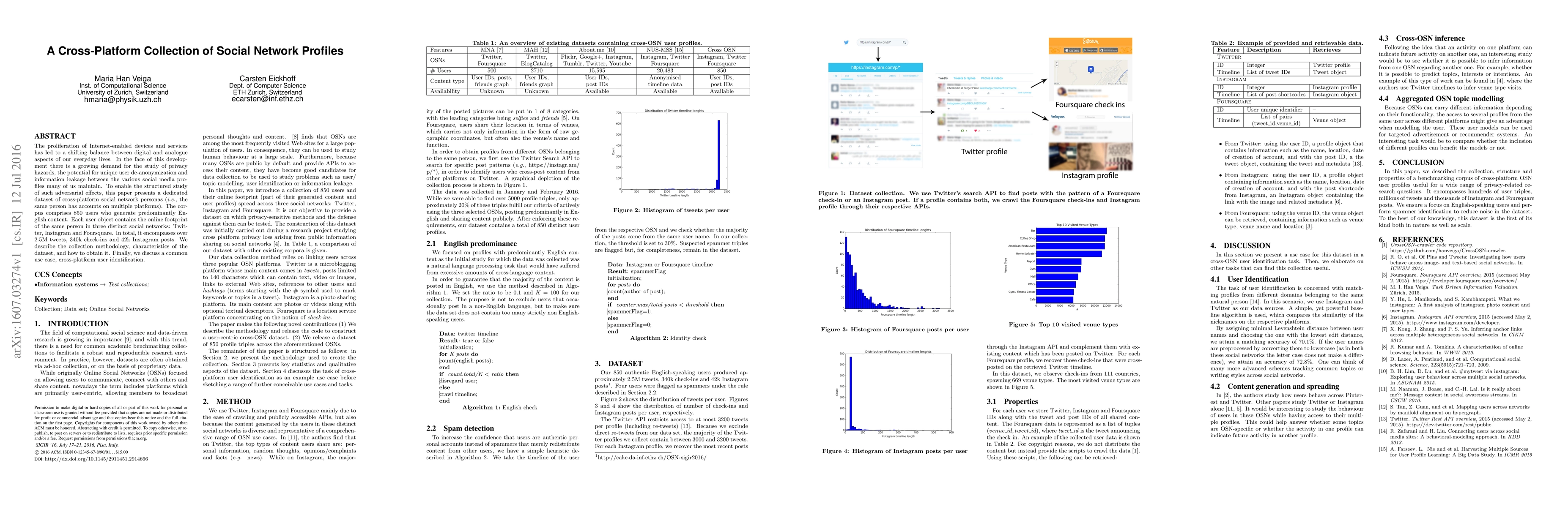 This paper presents a dataset of cross-platform social network profiles, comprising 850 users with accounts on Twitter, Instagram, and Foursquare, to study privacy hazards and user de-anonymization. The dataset includes over 2.5M tweets, 340k check-ins, and 42k Instagram posts, and discusses its methodology, characteristics, and applications like cross-platform user identification.