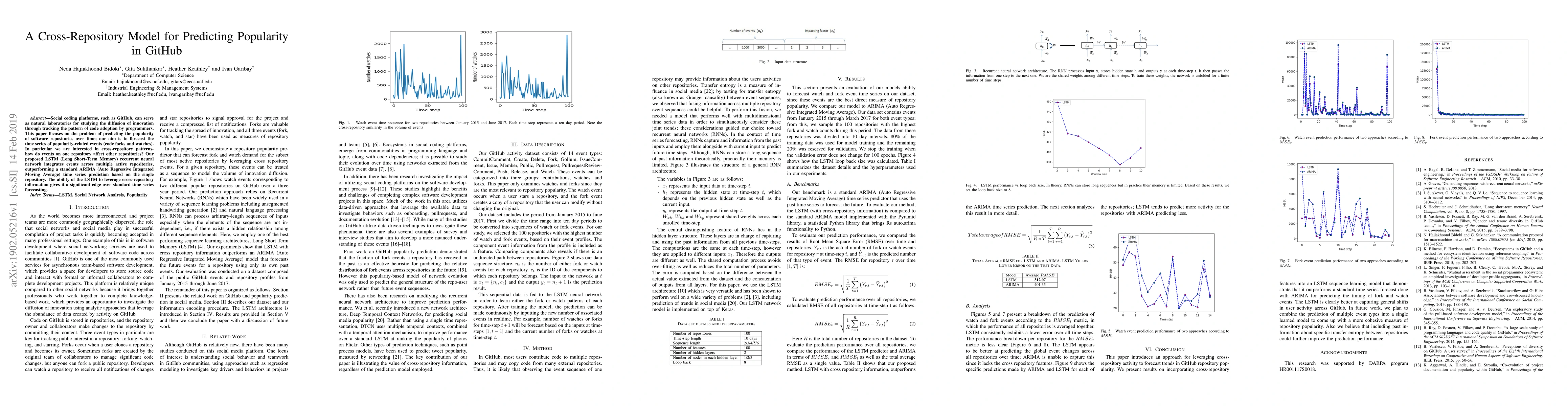 This paper proposes an LSTM model to predict the popularity of GitHub repositories by analyzing cross-repository patterns of code forks and watches. The LSTM outperforms a standard ARIMA model by leveraging information from multiple repositories, enhancing time series forecasting accuracy.