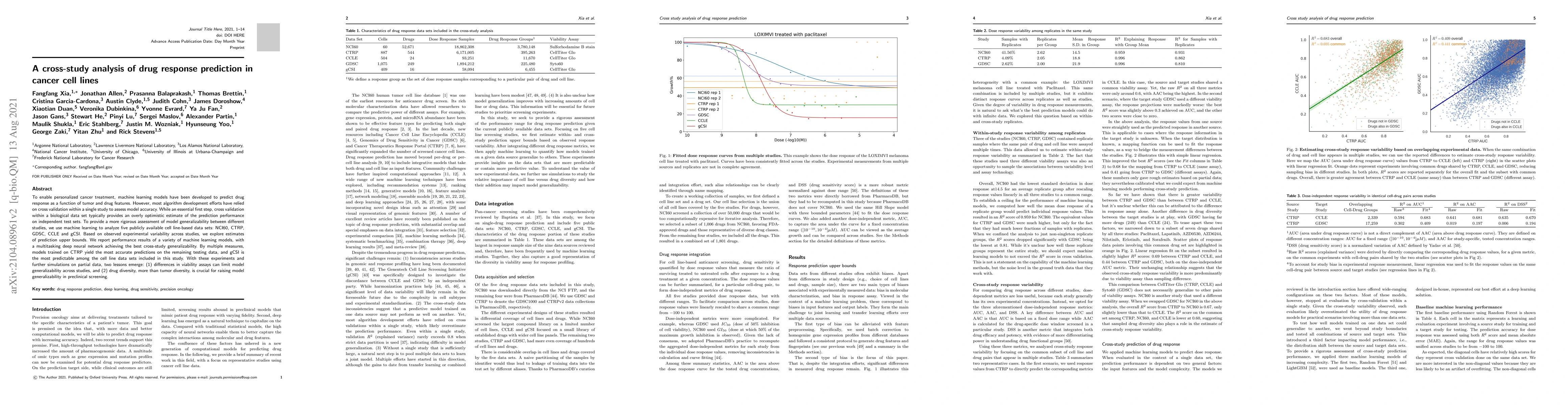 This study evaluates machine learning models for predicting drug response across five cancer cell line datasets to assess generalizability. A multitasking deep neural network showed the best cross-study performance, highlighting that differences in viability assays and drug diversity significantly impact model accuracy and generalizability.