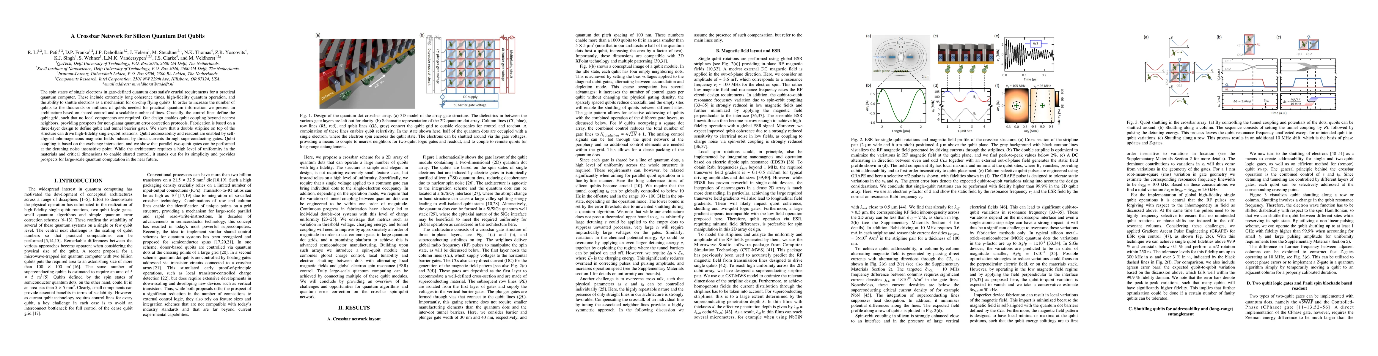 The paper proposes a crossbar network architecture for silicon quantum dot qubits, enabling high-fidelity operations and scalability to millions of qubits. It employs shared control lines defining qubit grid, eliminating local components, and allowing non-planar quantum error correction. Fabrication uses a three-layer design and superconducting gates for qubit addressability and readout. The architecture demands high material and dimension uniformity but offers simplicity and prospects for large-scale quantum computation.