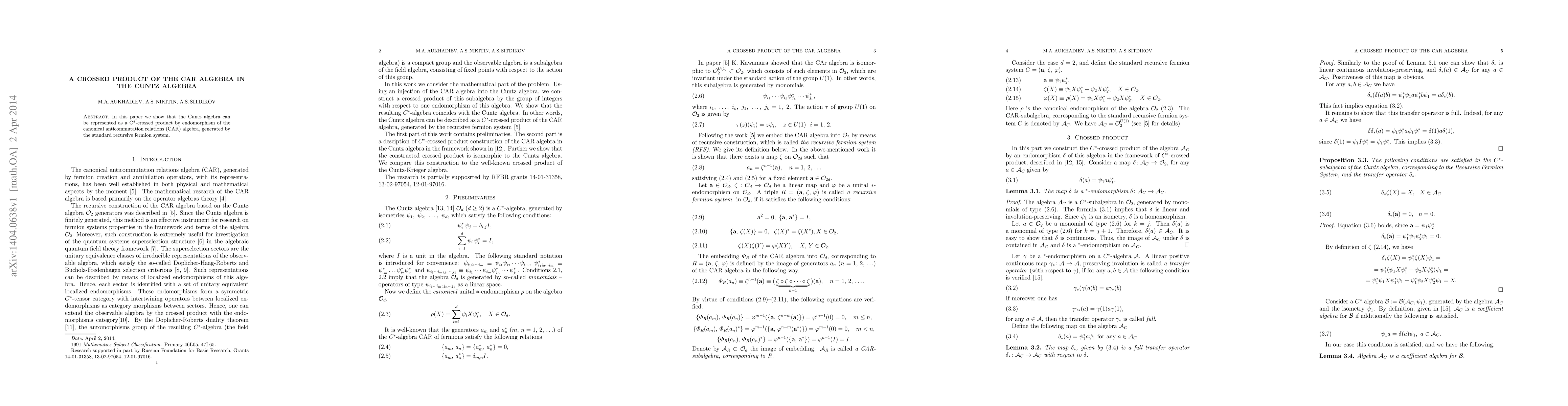 Summary: This paper demonstrates that the Cuntz algebra can be represented as a C*-crossed product derived from endomorphisms of the CAR algebra, which is generated by a standard recursive fermion system. The result provides a new perspective on the relationship between these two important algebraic structures.