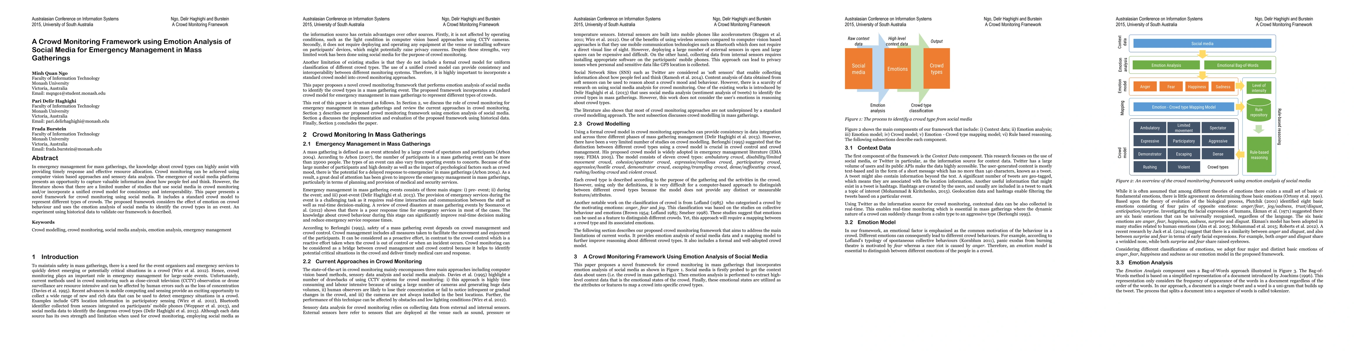 This paper proposes a novel framework for crowd monitoring during mass gatherings using social media data to analyze emotions and identify crowd types, aiming to improve emergency management. The framework includes a standard crowd model and validates the approach using historical event data.