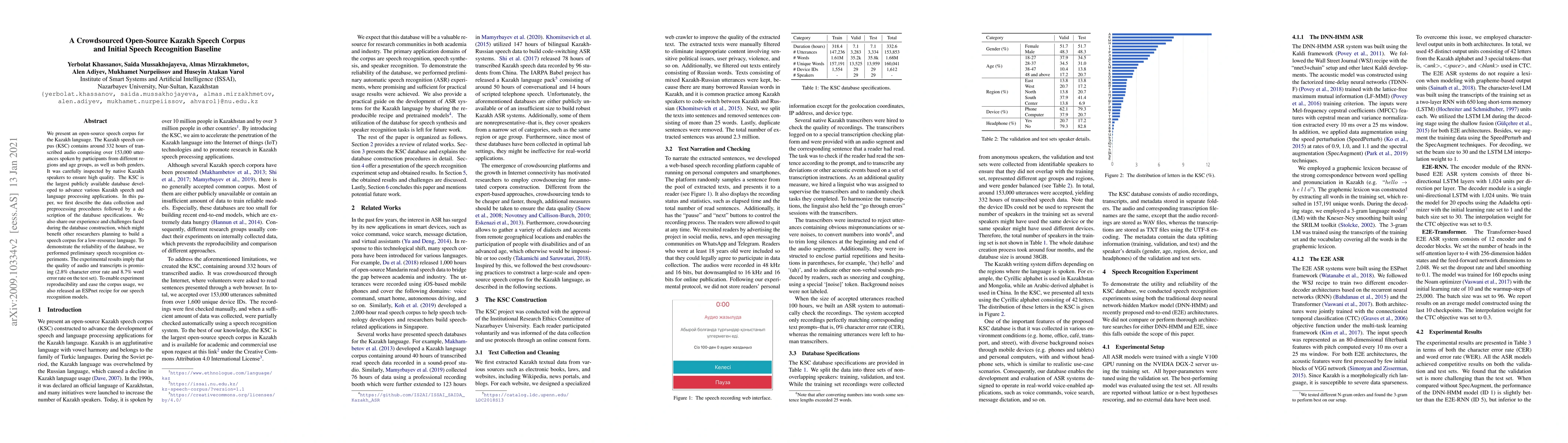 This paper introduces an open-source Kazakh speech corpus containing 332 hours of audio from diverse speakers, aiming to advance Kazakh speech and language processing. Preliminary speech recognition experiments show promising results with a 2.8% character error rate and 8.7% word error rate, along with an ESPnet recipe for reproducibility.