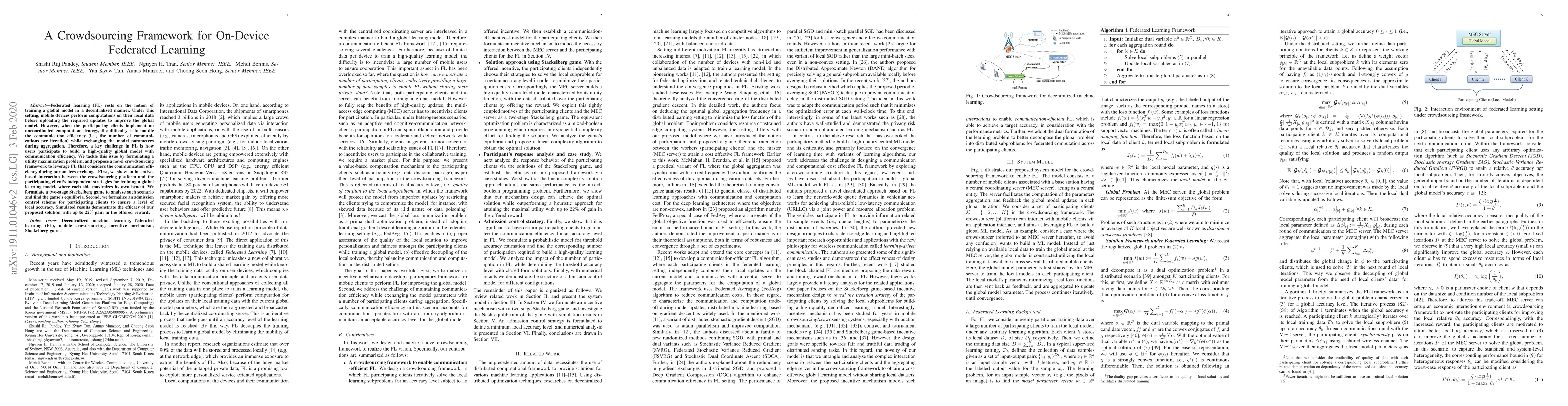 Federated learning (FL) rests on the notion of training a global model in a decentralized manner. Under this setting, mobile devices perform computations on their local data before uploading the required updates to improve the global model. However, when the participating clients implement an uncoordinated computation strategy, the difficulty is to handle the communication efficiency (i.e., the number of communications per iteration) while exchanging the model parameters during aggregation. Therefore, a key challenge in FL is how users participate to build a high-quality global model with communication efficiency. We tackle this issue by formulating a utility maximization problem, and propose a novel crowdsourcing framework to leverage FL that considers the communication efficiency during parameters exchange. First, we show an incentive-based interaction between the crowdsourcing platform and the participating client's independent strategies for training a global learning model, where each side maximizes its own benefit. We formulate a two-stage Stackelberg game to analyze such scenario and find the game's equilibria. Second, we formalize an admission control scheme for participating clients to ensure a level of local accuracy. Simulated results demonstrate the efficacy of our proposed solution with up to 22% gain in the offered reward.