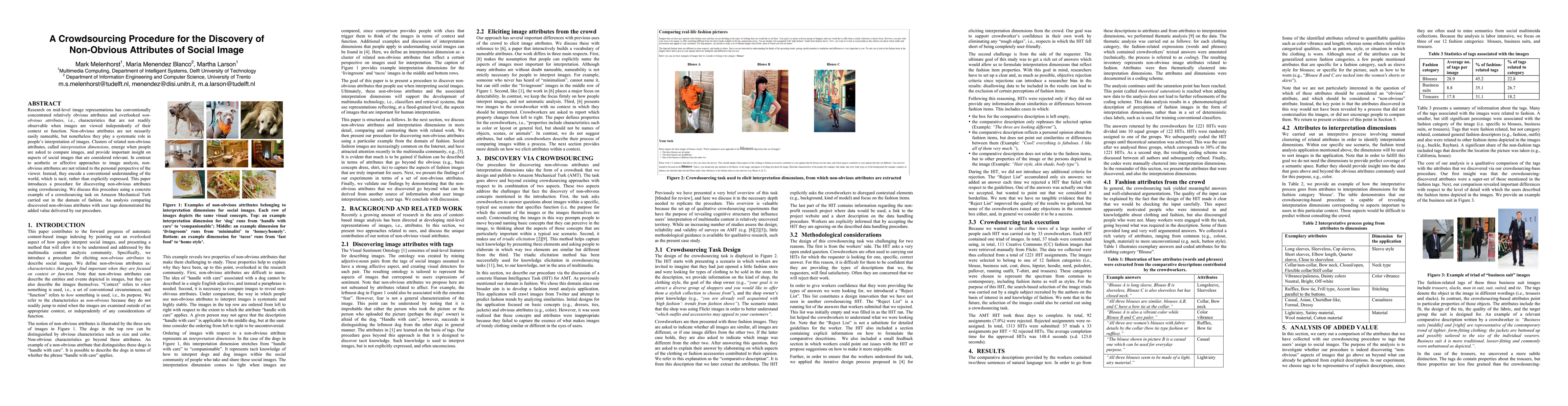 Research on mid-level image representations has conventionally concentrated relatively obvious attributes and overlooked non-obvious attributes, i.e., characteristics that are not readily observable when images are viewed independently of their context or function. Non-obvious attributes are not necessarily easily nameable, but nonetheless they play a systematic role in people`s interpretation of images. Clusters of related non-obvious attributes, called interpretation dimensions, emerge when people are asked to compare images, and provide important insight on aspects of social images that are considered relevant. In contrast to aesthetic or affective approaches to image analysis, non-obvious attributes are not related to the personal perspective of the viewer. Instead, they encode a conventional understanding of the world, which is tacit, rather than explicitly expressed. This paper introduces a procedure for discovering non-obvious attributes using crowdsourcing. We discuss this procedure using a concrete example of a crowdsourcing task on Amazon Mechanical Turk carried out in the domain of fashion. An analysis comparing discovered non-obvious attributes with user tags demonstrated the added value delivered by our procedure.