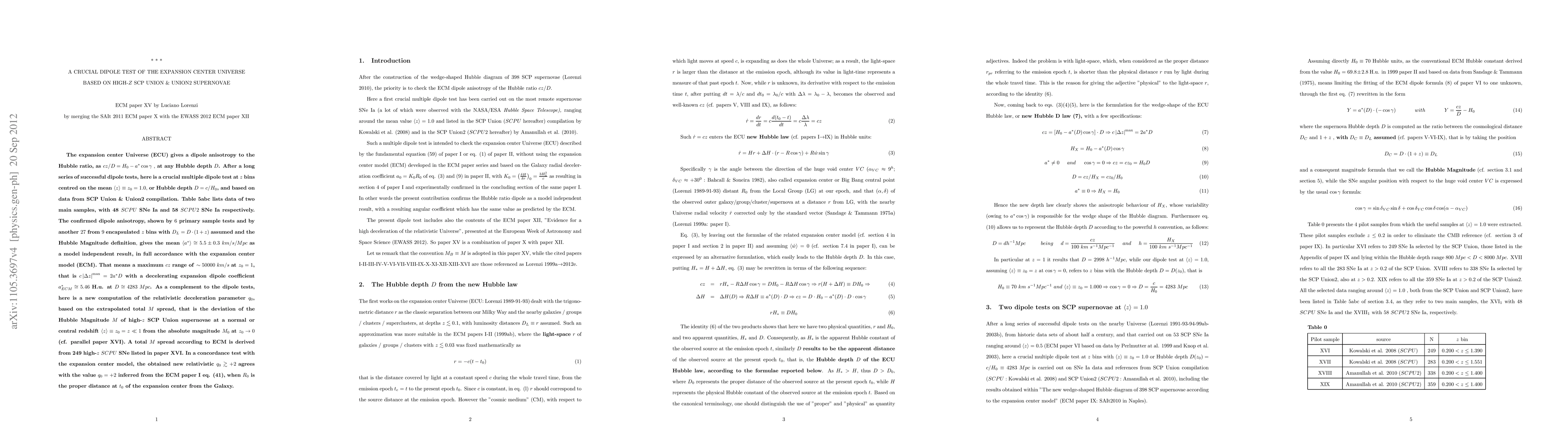 This paper conducts a crucial dipole test of the expansion center Universe (ECU) model using high-z SCP Union & Union2 supernovae data, confirming dipole anisotropy and supporting the ECU model. Additionally, a new computation of the relativistic deceleration parameter q0 aligns with the model's predictions.