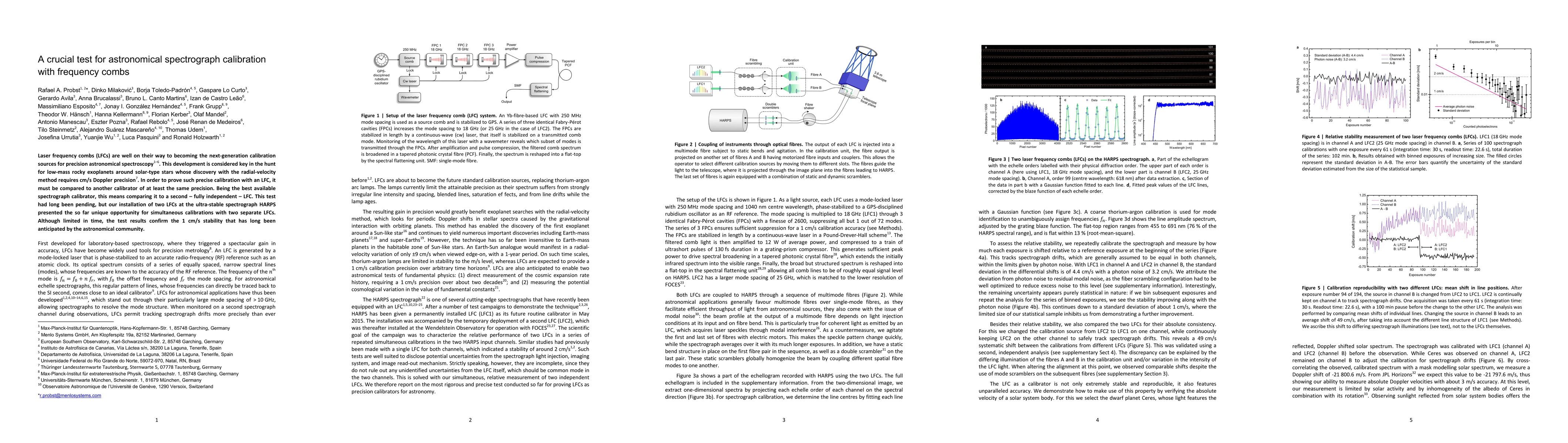 The paper details a significant test comparing two laser frequency combs (LFCs) for precise astronomical spectrograph calibration, demonstrating a stability of 1 cm/s, which is crucial for detecting low-mass rocky exoplanets using the radial-velocity method. This validation, achieved using the HARPS spectrograph, confirms the anticipated precision of LFCs for future astronomical spectroscopy.