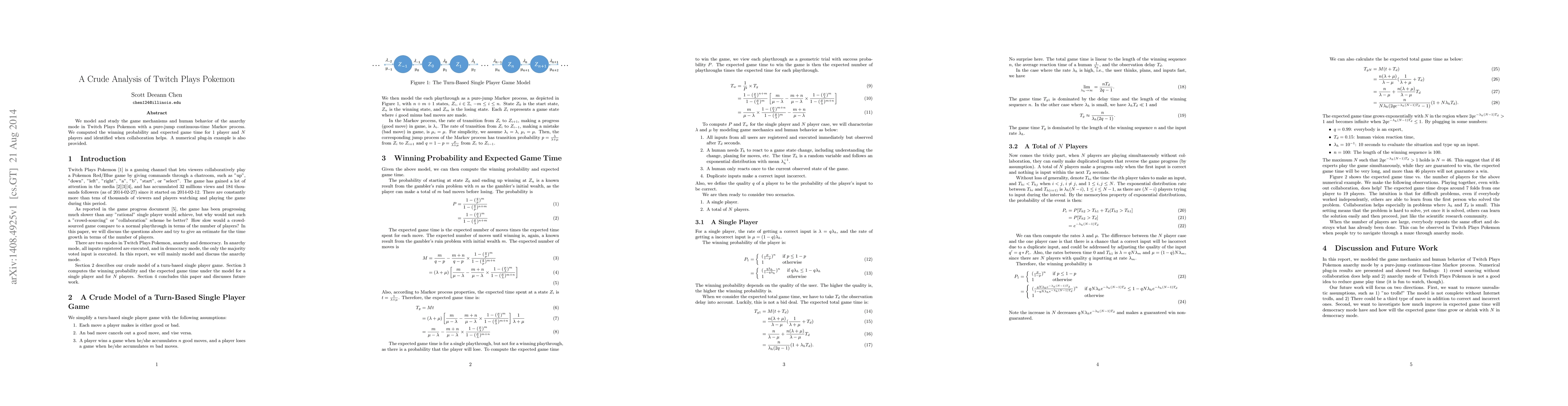 This paper models Twitch Plays Pokemon's anarchy mode using a continuous-time Markov process to analyze game dynamics and human behavior, computing winning probabilities and expected game times for both single and multiple players, and identifying conditions under which collaboration is beneficial. A numerical example is provided to illustrate the findings.