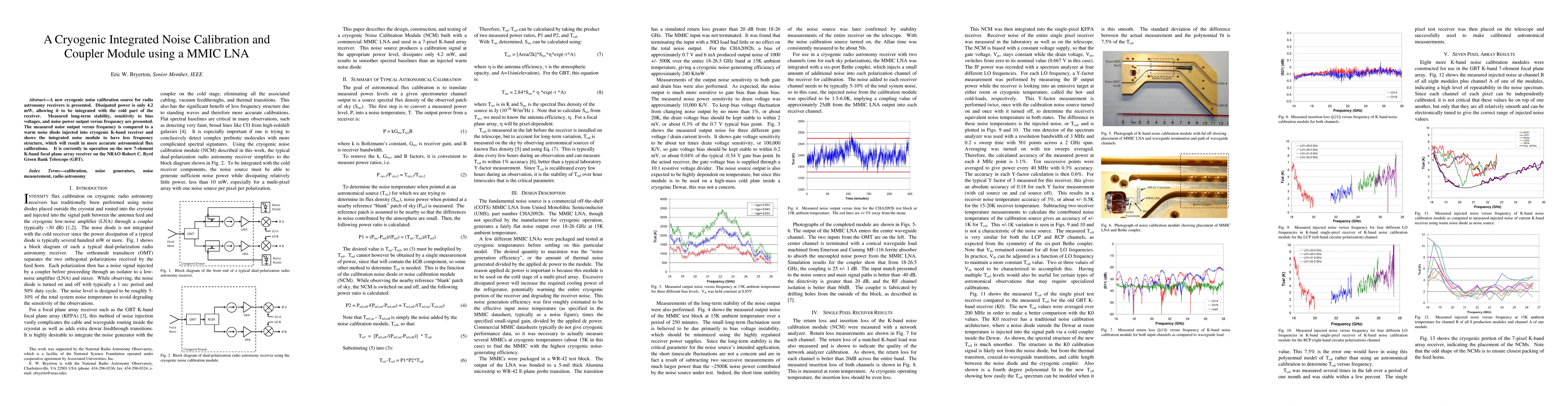 This paper introduces a cryogenic integrated noise calibration module using a MMIC LNA, dissipating only 4.2 mW, which enhances the accuracy of radio astronomy receivers. The module shows improved long-term stability and less frequency structure compared to a warm noise diode, benefiting astronomical flux calibrations.