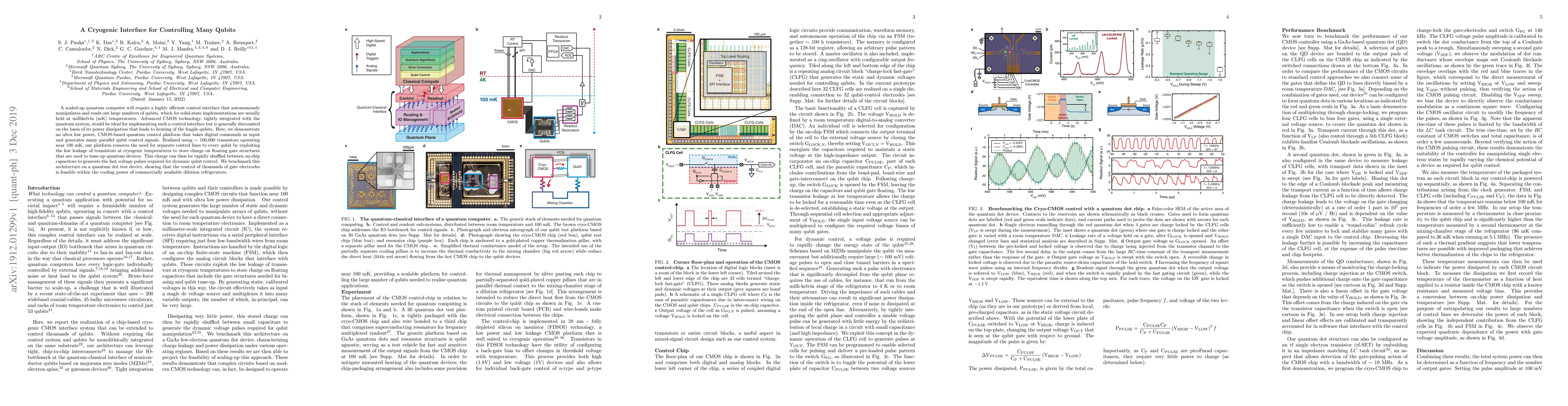 A scaled-up quantum computer will require a highly efficient control interface that autonomously manipulates and reads out large numbers of qubits, which for solid-state implementations are usually held at millikelvin (mK) temperatures. Advanced CMOS technology, tightly integrated with the quantum system, would be ideal for implementing such a control interface but is generally discounted on the basis of its power dissipation that leads to heating of the fragile qubits. Here, we demonstrate an ultra low power, CMOS-based quantum control platform that takes digital commands as input and generates many parallel qubit control signals. Realized using 100,000 transistors operating near 100 mK, our platform alleviates the need for separate control lines to every qubit by exploiting the low leakage of transistors at cryogenic temperatures to store charge on floating gate structures that are used to tune-up quantum devices. This charge can then be rapidly shuffled between on-chip capacitors to generate the fast voltage pulses required for dynamic qubit control. We benchmark this architecture on a quantum dot test device, showing that the control of thousands of gate electrodes is feasible within the cooling power of commercially available dilution refrigerators.