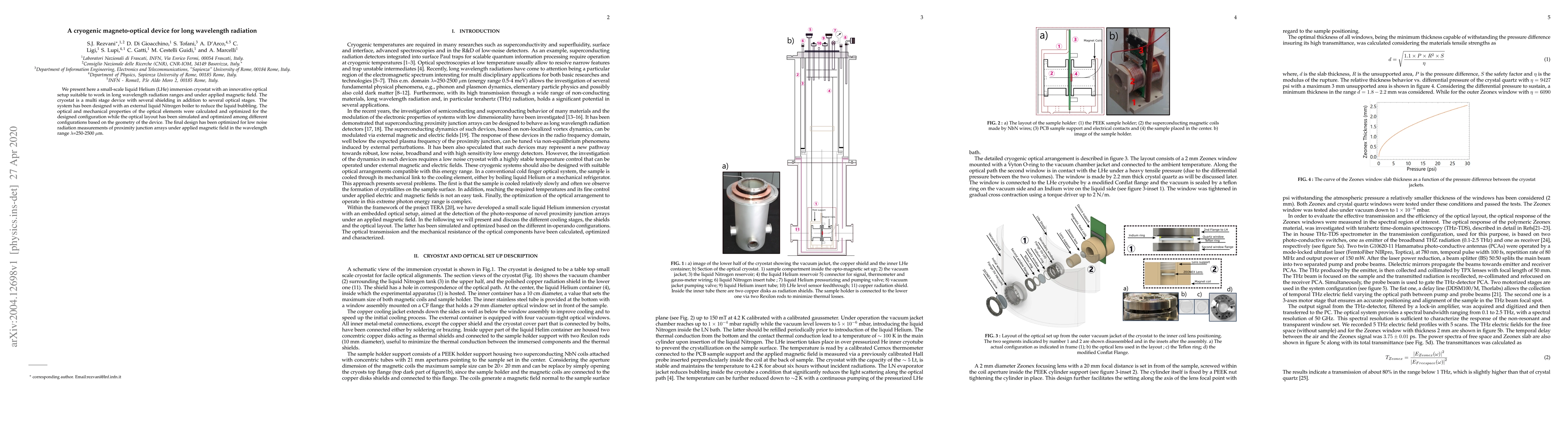 We present here a small-scale liquid Helium (LHe) immersion cryostat with an innovative optical setup suitable to work in long wavelength radiation ranges and under applied magnetic field. The cryostat is a multi stage device with several shielding in addition to several optical stages. The system has been designed with an external liquid Nitrogen boiler to reduce the liquid bubbling. The optical and mechanical properties of the optical elements were calculated and optimized for the designed configuration while the optical layout has been simulated and optimized among different configurations based on the geometry of the device. The final design has been optimized for low noise radiation measurements of proximity junction arrays under applied magnetic field in the wavelength range $\lambda$=250-2500 $\mu$m.