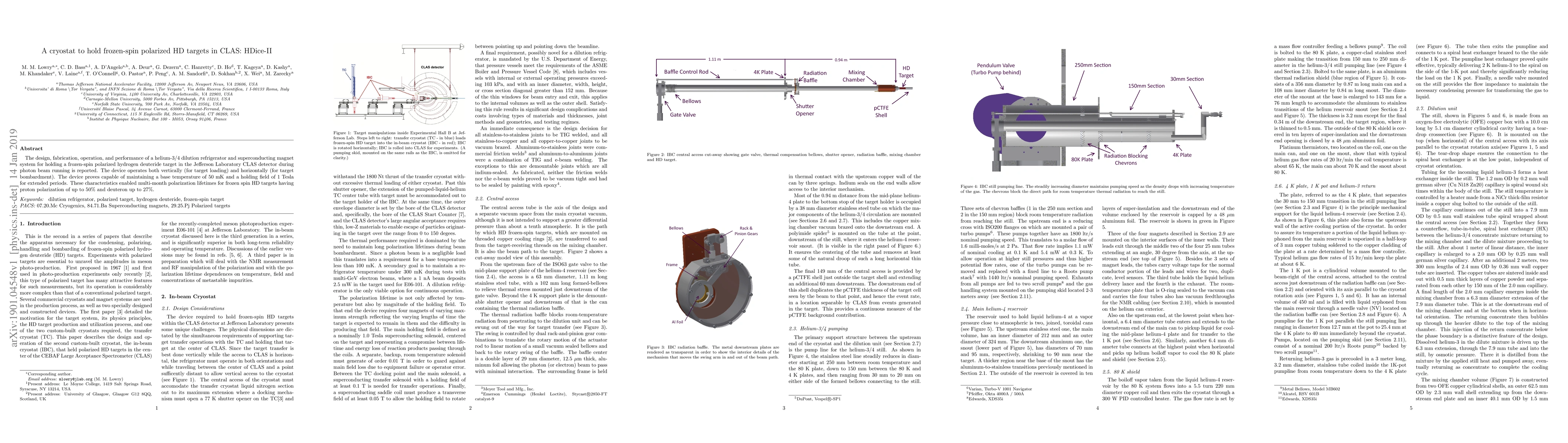 The paper details the design and operation of a helium-3/4 dilution refrigerator and magnet system for maintaining frozen-spin polarized hydrogen deuteride (HD) targets in the CLAS detector. The device sustains a base temperature of 50 mK and a holding field of 1 Tesla, enabling multi-month polarization lifetimes for targets with proton polarizations up to 50% and deuteron up to 27%.