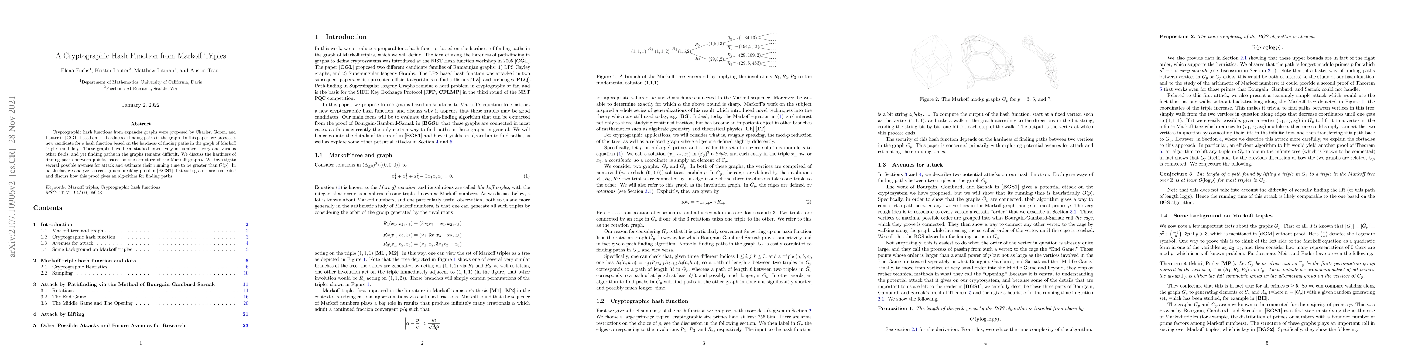 This paper proposes a new cryptographic hash function based on the difficulty of finding paths in the graph of Markoff triples modulo p. The authors analyze the hardness of such paths and discuss potential attack avenues, estimating their running time to be greater than O(p).