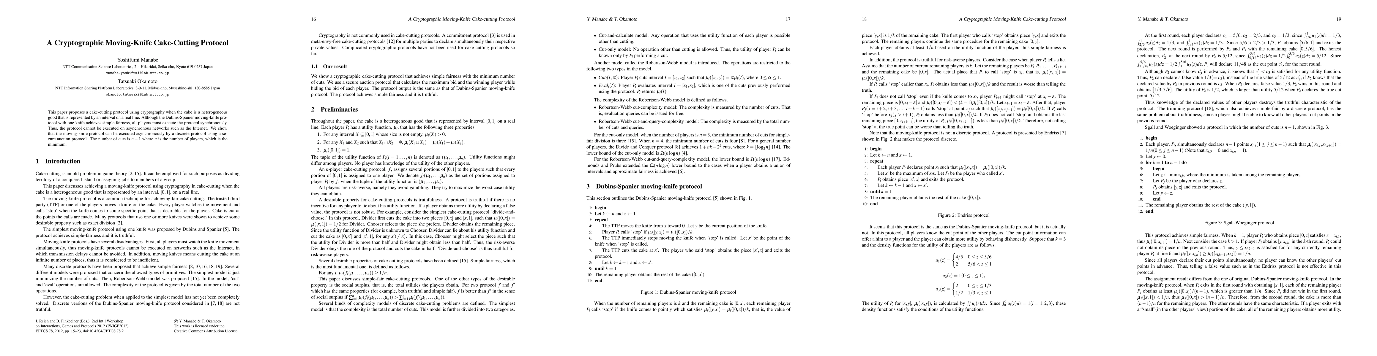 This paper proposes a cake-cutting protocol using cryptography when the cake is a heterogeneous good that is represented by an interval on a real line. Although the Dubins-Spanier moving-knife protocol with one knife achieves simple fairness, all players must execute the protocol synchronously. Thus, the protocol cannot be executed on asynchronous networks such as the Internet. We show that the moving-knife protocol can be executed asynchronously by a discrete protocol using a secure auction protocol. The number of cuts is n-1 where n is the number of players, which is the minimum.