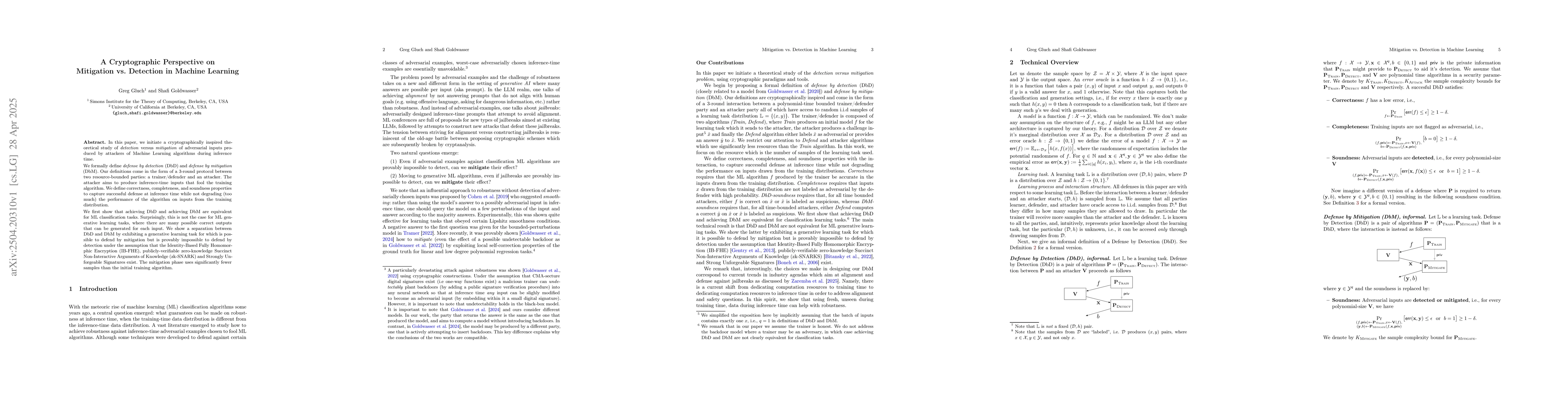The paper initiates a cryptographically inspired theoretical study, defining defense by detection (DbD) and defense by mitigation (DbM) through a 3-round protocol between a trainer/defender and an attacker. It explores equivalence and separation of DbD and DbM for classification and generative learning tasks, respectively, under cryptographic assumptions.
