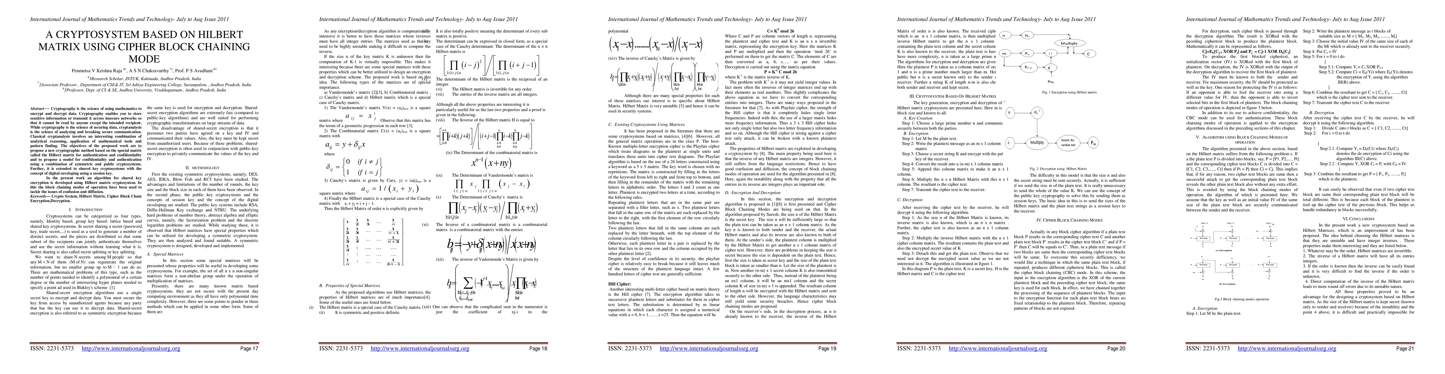 Cryptography is the science of using mathematics to encrypt and decrypt data. Cryptography enables you to store sensitive information or transmit it across insecure networks so that it cannot be read by anyone except the intended recipient. While cryptography is the science of securing data, cryptanalysis is the science of analyzing and breaking secure communication. Classical cryptanalysis involves an interesting combination of analytical reasoning, application of mathematical tools and pattern finding. The objectives of the proposed work are to propose a new cryptographic method based on the special matrix called the Hilbert matrix for authentication and confidentiality and to propose a model for confidentiality and authentication using a combination of symmetric and public cryptosystems. Further, it is extended to shared key cryptosystems with the concept of digital enveloping using a session key. In the present work an algorithm for shared key encryption is developed using Hilbert matrix cryptosystem. In this the block chaining modes of operation have been used to tackle the issues of confusion and diffusion.
