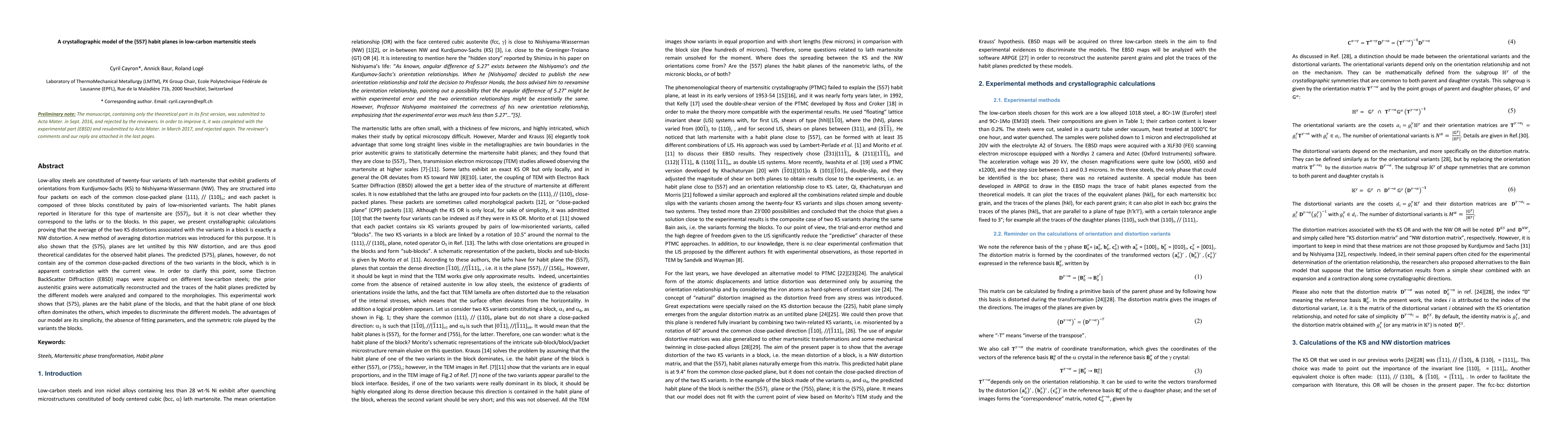 Low-alloy steels are constituted of twenty-four variants of lath martensite that exhibit gradients of orientations from Kurdjumov-Sachs (KS) to Nishiyama-Wassermann (NW). They are structured into four packets on each of the common close-packed plane {111}fcc// {110}bcc; and each packet is composed of three blocks constituted by pairs of low-misoriented variants. The habit planes reported in literature for this type of martensite are {557}fcc, but it is not clear whether they correspond to the laths or to the blocks. In this paper, we present crystallographic calculations proving that the average of the two KS distortions associated with the variants in a block is exactly a NW distortion. A new method of averaging distortion matrices was introduced for this purpose. It is also shown that the {575}fcc planes are let untilted by this NW distortion, and are thus good theoretical candidates for the observed habit planes. The predicted {575}fcc planes, however, do not contain any of the common close-packed directions of the two variants in the block, which is in apparent contradiction with the current view. In order to clarify this point, some Electron BackScatter Diffraction (EBSD) maps were acquired on different low-carbon steels; the prior austenitic grains were automatically reconstructed and the traces of the habit planes predicted by the different models were analyzed and compared to the morphologies. This experimental work shows that {575}fcc planes are the habit plane of the blocks, and that the habit plane of one block often dominates the others, which impedes to discriminate the different models. The advantages of our model are its simplicity, the absence of fitting parameters, and the symmetric role played by the variants the blocks.
