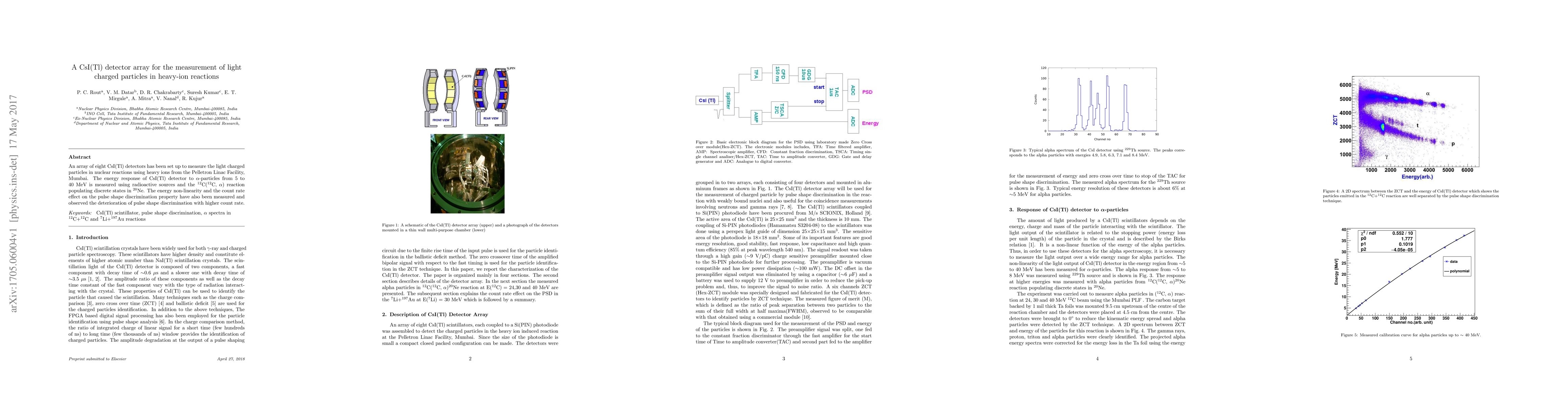An array of eight CsI(Tl) detectors has been set up to measure the light charged particles in nuclear reactions using heavy ions from the Pelletron Linac Facility, Mumbai. The energy response of CsI(Tl) detector to $\alpha$-particles from 5 to 40 MeV is measured using radioactive sources and the $^{12}$C($^{12}$C, $\alpha$) reaction populating discrete states in $^{20}$Ne. The energy non-linearity and the count rate effect on the pulse shape discrimination property have also been measured and observed the deterioration of pulse shape discrimination with higher count rate.