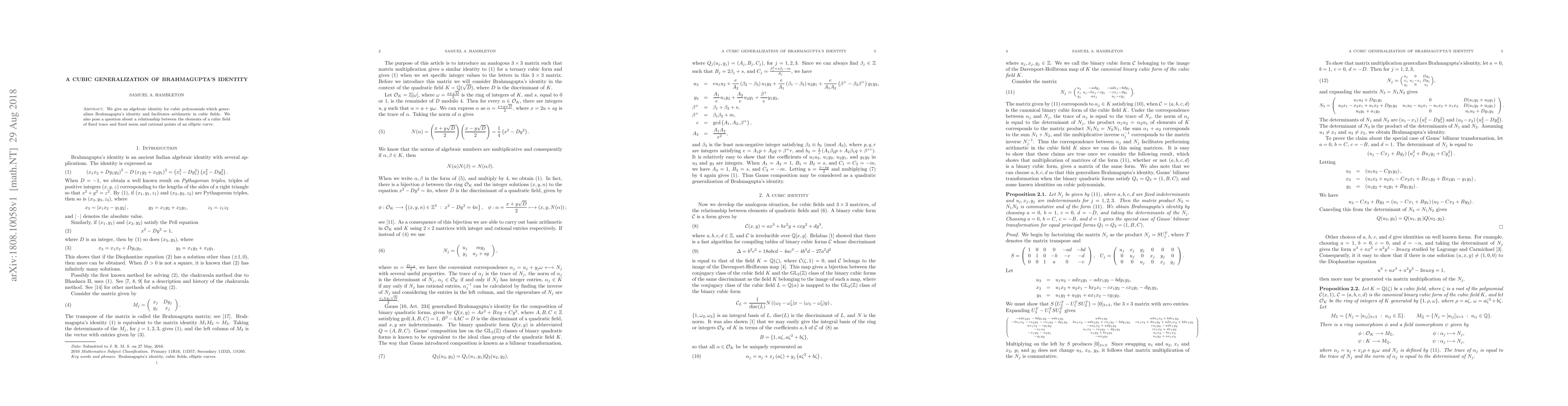 Summary: This paper presents an algebraic identity for cubic polynomials that extends Brahmagupta's identity, enhancing arithmetic in cubic fields. It also raises a question linking elements of a cubic field with rational points on an elliptic curve.