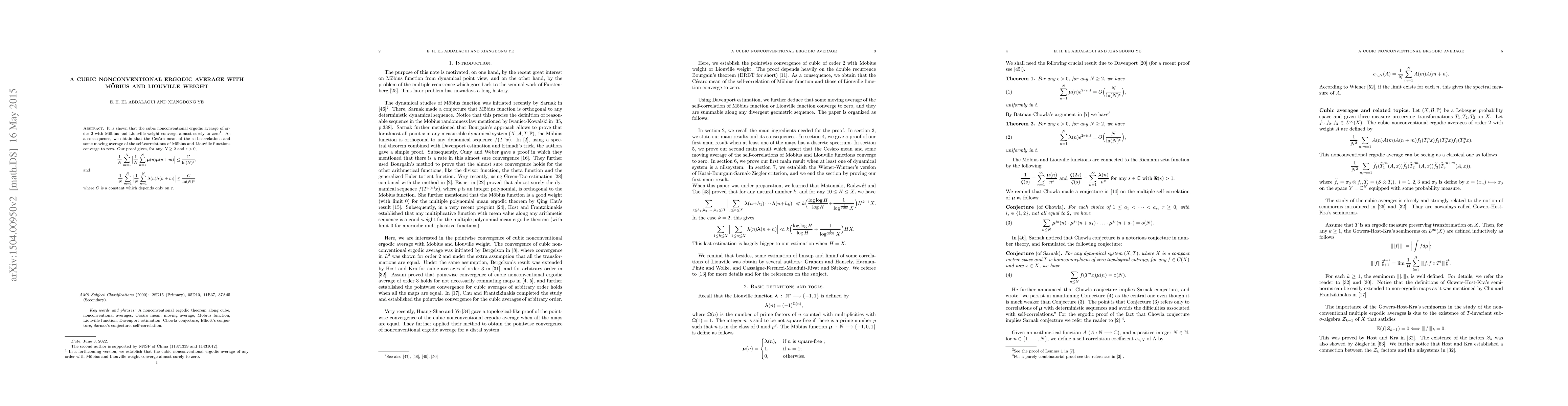 This paper demonstrates that the cubic nonconventional ergodic average of order 2, weighted by M\"obius and Liouville functions, converges almost surely to zero. Consequently, the Ces\`aro mean and certain moving averages of the self-correlations of these functions also converge to zero.