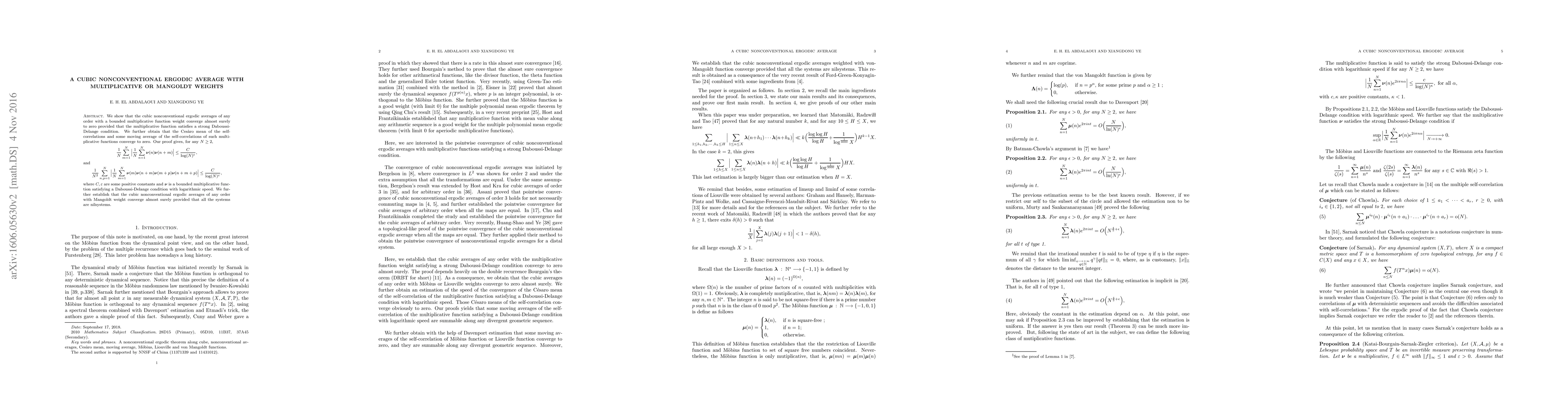 We show that the cubic nonconventional ergodic averages of any order with a bounded multiplicative function weight converge almost surely to zero provided that the multiplicative function satisfies a strong Daboussi-Delange condition. We further obtain that the Ces\`{a}ro mean of the self-correlations and some moving average of the self-correlations of such multiplicative functions converge to zero. Our proof gives, for any $N \geq 2$, $$\frac1{N}\sum_{m=1}^{N}\Big|\frac1{N}\sum_{n=1}^{N} \bnu(n) \bnu(n+m)\Big| \leq \frac{C}{\log(N)^{\epsilon}},$$ and $$\frac1{N^2}\sum_{n,p=1}^{N}\Big|\frac1{N}\sum_{m=1}^{N} \bnu(m) \bnu(n+m)\bnu(m+p)\bnu(n+m+p)\Big| \leq \frac{C}{\log(N)^{\varepsilon}},$$ where $C,\varepsilon$ are some positive constants and $\bnu$ is a bounded multiplicative function satisfying a Daboussi-Delange condition with logarithmic speed. We further establish that the cubic nonconventional ergodic averages of any order with Mangoldt weight converge almost surely provided that all the systems are nilsystems.