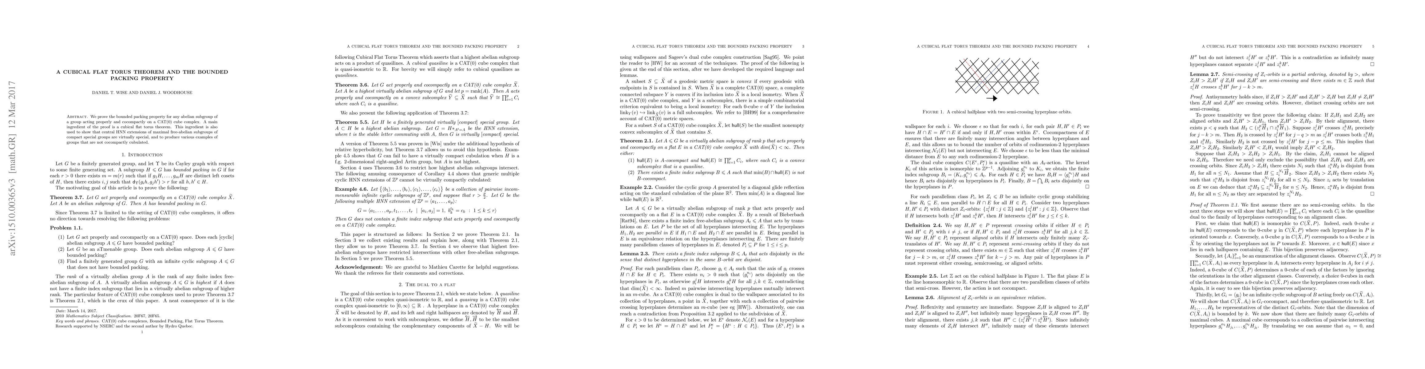 We prove the bounded packing property for any abelian subgroup of a group acting properly and cocompactly on a CAT(0) cube complex. A main ingredient of the proof is a cubical flat torus theorem. This ingredient is also used to show that central HNN extensions of maximal free-abelian subgroups of compact special groups are virtually special, and to produce various examples of groups that are not cocompactly cubulated.