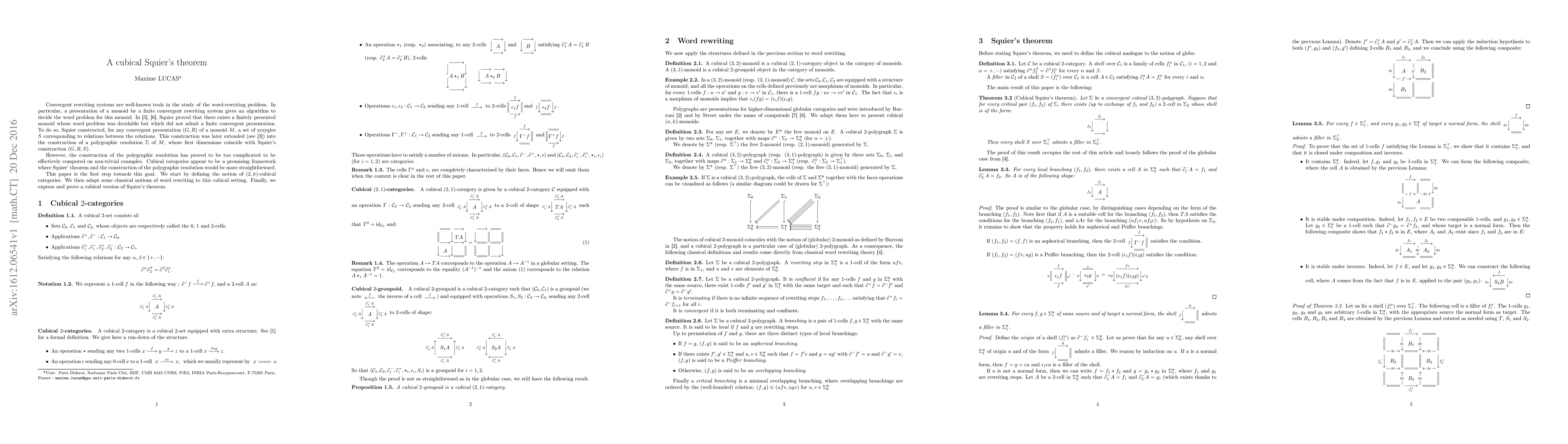 Convergent rewriting systems are well-known tools in the study of the word-rewriting problem. In particular, a presentation of a monoid by a finite convergent rewriting system gives an algorithm to decide the word problem for this monoid. Squier proved that there exists a finitely presented monoid whose word problem was decidable but which did not admit a finite convergent presentation. To do so, Squier constructed, for any convergent presentation $(G,R)$ of a monoid $M$, a set of syzygies $S$ corresponding to relations between the relations. This construction was later extended into the construction of a polygraphic resolution $\Sigma$ of $M$, whose first dimensions coincide with Squier's construction $(G,R,S)$. However, the construction of the polygraphic resolution has proved to be too complicated to be effectively computed on non-trivial examples. Cubical categories appear to be a promising framework where Squier's theorem and the construction of the polygraphic resolution would be more straightforward. This paper is the first step towards this goal. We start by defining the notion of $(2,k)$-cubical categories. We then adapt some classical notions of word rewriting to this cubical setting. Finally, we express and prove a cubical version of Squier's theorem.