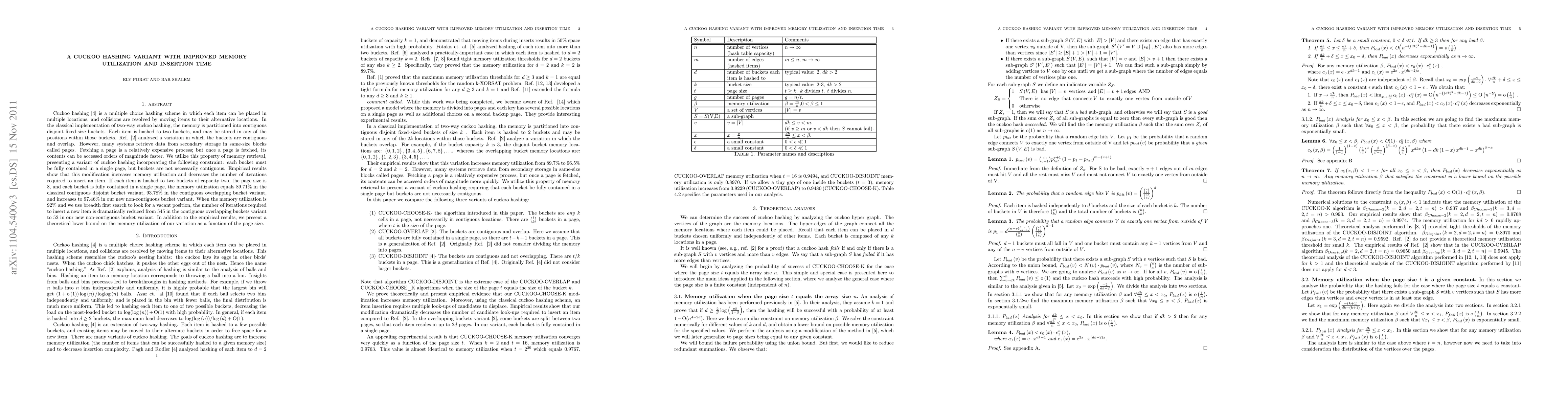 This paper proposes a variant of cuckoo hashing where each bucket fits within a single memory page, improving memory utilization and reducing insertion time. Empirical results show a significant increase in memory utilization and a substantial decrease in the number of iterations required for insertion compared to traditional variants.