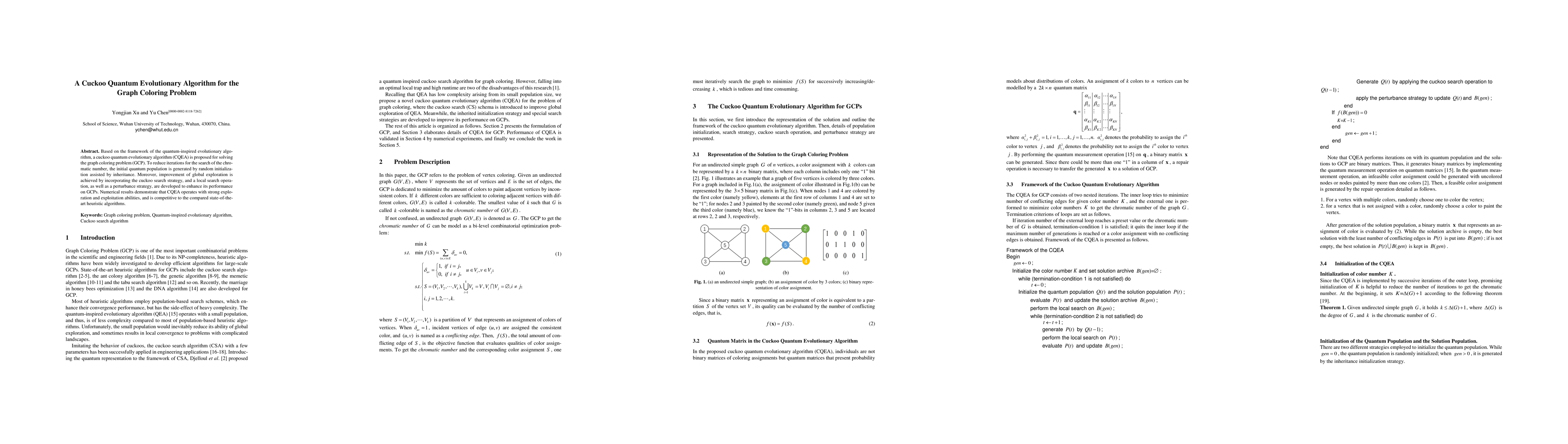 The cuckoo quantum evolutionary algorithm (CQEA) leverages quantum-inspired evolutionary techniques to solve the graph coloring problem (GCP), combining random initialization with inheritance for quantum population generation, and incorporating cuckoo search for global exploration, alongside a local search and perturbance strategy for enhanced performance. Numerical results show CQEA's competitive effectiveness against state-of-the-art heuristic algorithms.