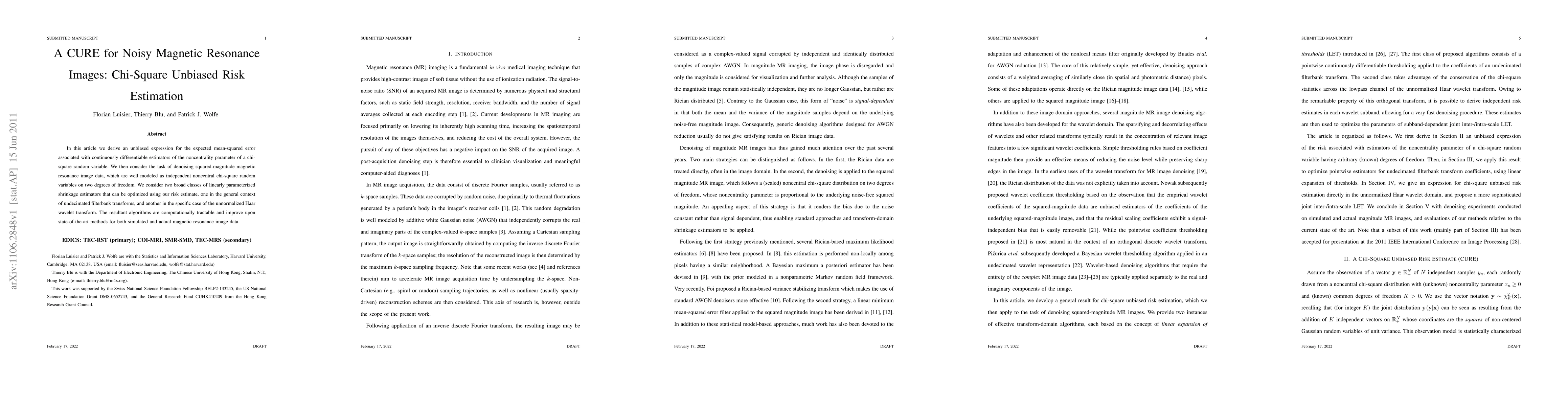 This paper develops an unbiased risk estimation method for denoising magnetic resonance images, modeling them as noncentral chi-square random variables. It proposes two classes of shrinkage estimators optimized using the derived risk estimate, showing improved performance over existing methods in both simulated and real data scenarios.