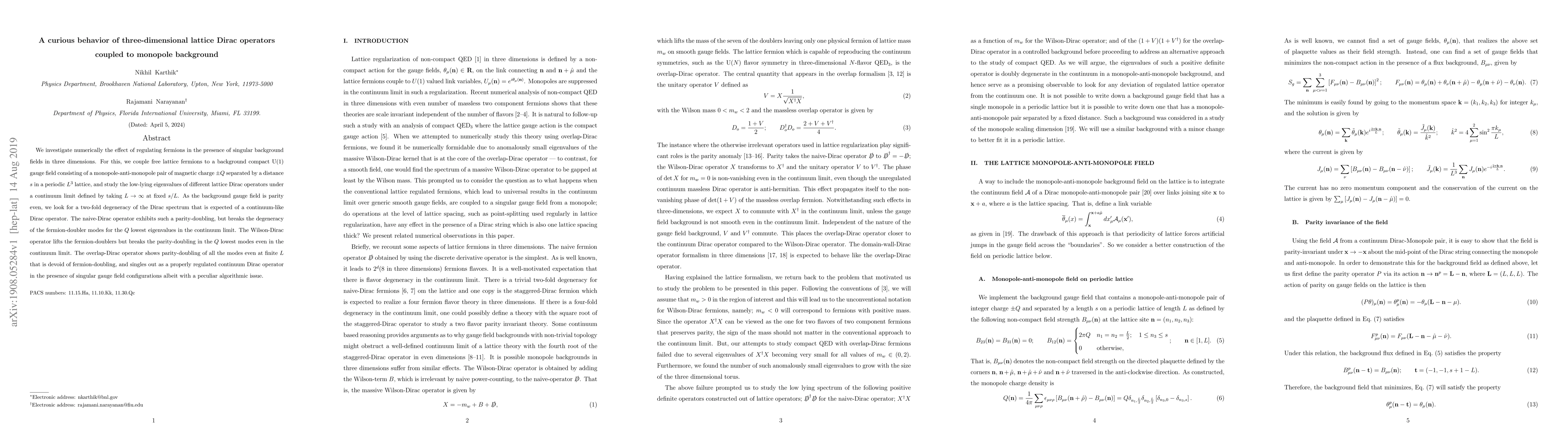 We investigate numerically the effect of regulating fermions in the presence of singular background fields in three dimensions. For this, we couple free lattice fermions to a background compact U(1) gauge field consisting of a monopole-anti-monopole pair of magnetic charge $\pm Q$ separated by a distance $s$ in a periodic $L^3$ lattice, and study the low-lying eigenvalues of different lattice Dirac operators under a continuum limit defined by taking $L\to\infty$ at fixed $s/L$. As the background gauge field is parity even, we look for a two-fold degeneracy of the Dirac spectrum that is expected of a continuum-like Dirac operator. The naive-Dirac operator exhibits such a parity-doubling, but breaks the degeneracy of the fermion-doubler modes for the $Q$ lowest eigenvalues in the continuum limit. The Wilson-Dirac operator lifts the fermion-doublers but breaks the parity-doubling in the $Q$ lowest modes even in the continuum limit. The overlap-Dirac operator shows parity-doubling of all the modes even at finite $L$ that is devoid of fermion-doubling, and singles out as a properly regulated continuum Dirac operator in the presence of singular gauge field configurations albeit with a peculiar algorithmic issue.