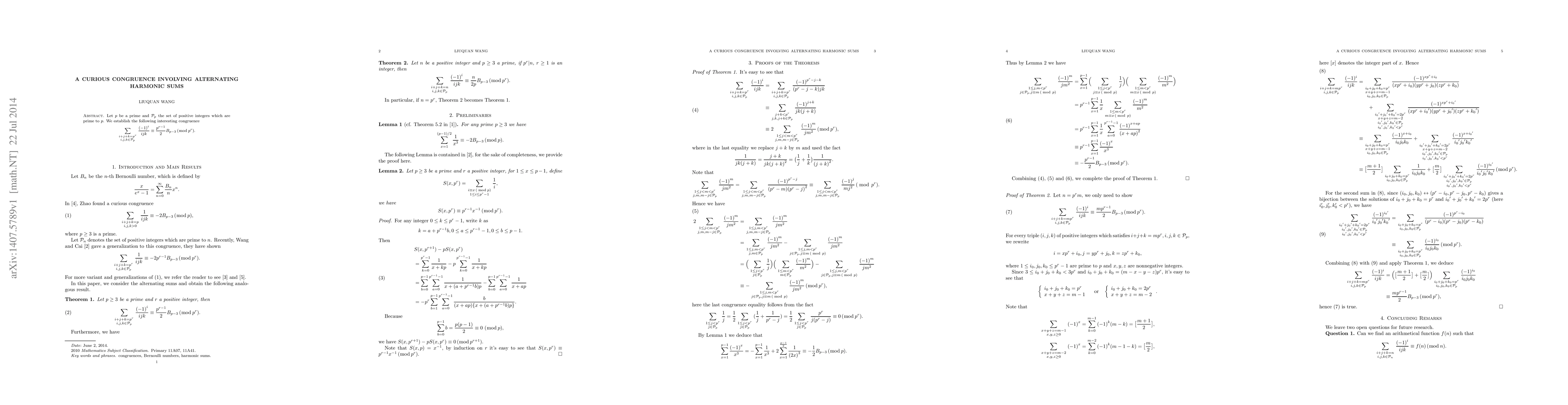 This research establishes a fascinating congruence involving alternating harmonic sums for a prime p. The congruence holds for sums where i, j, k are integers prime to p, summing to p^r, and is proven to equal (p^(r-1))/(2)*(B_(p-3)) (mod p^r).