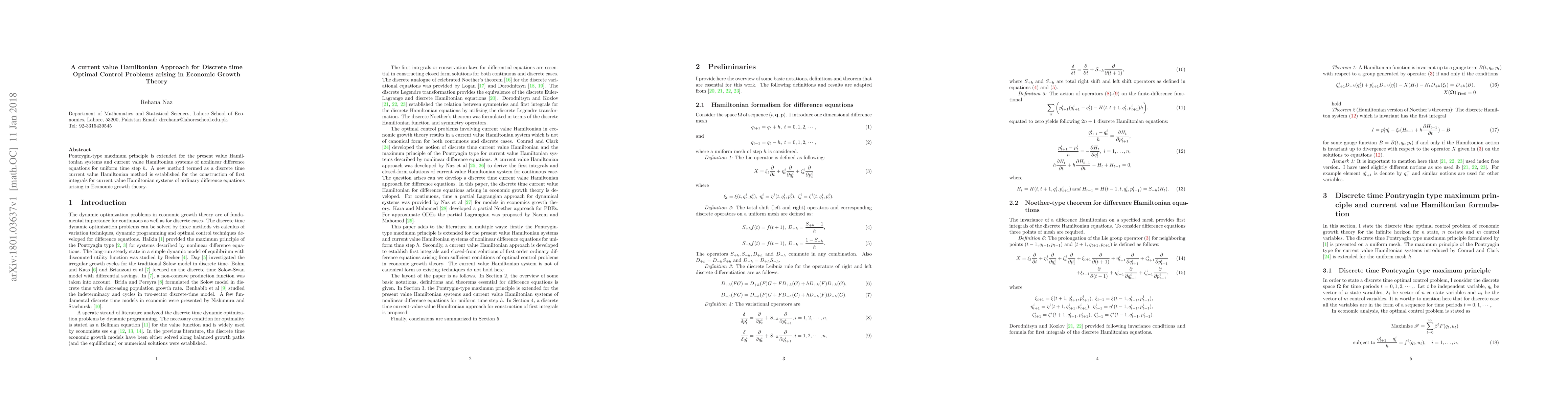 Pontrygin-type maximum principle is extended for the present value Hamiltonian systems and current value Hamiltonian systems of nonlinear difference equations for uniform time step $h$. A new method termed as a discrete time current value Hamiltonian method is established for the construction of first integrals for current value Hamiltonian systems of ordinary difference equations arising in Economic growth theory.