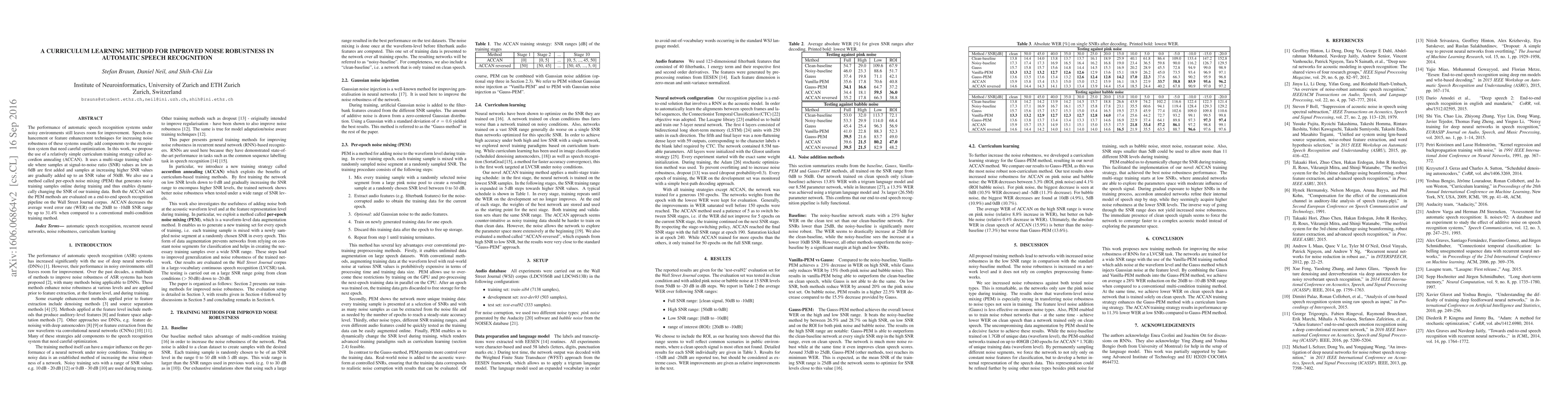 This paper proposes a curriculum learning method called accordion annealing (ACCAN) to improve noise robustness in automatic speech recognition. The method combines ACCAN and per-epoch noise mixing (PEM) to dynamically adjust training data SNR, achieving up to 31.4% reduction in word error rate compared to conventional training methods.