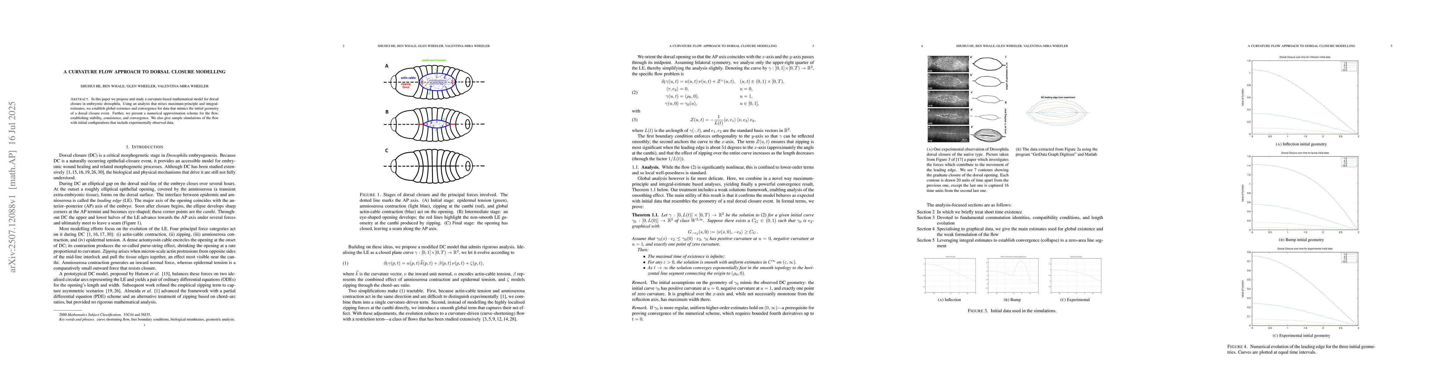 In this paper we propose and study a curvature-based mathematical model for dorsal closure in embryonic drosophila. Using an analysis that mixes maximum-principle and integral-estimates, we establish global existence and convergence for data that mimics the initial geometry of a dorsal closure event. Further, we present a numerical approximation scheme for the flow, establishing stability, consistence, and convergence. We also give sample simulations of the flow with initial configurations that include experimentally observed data.