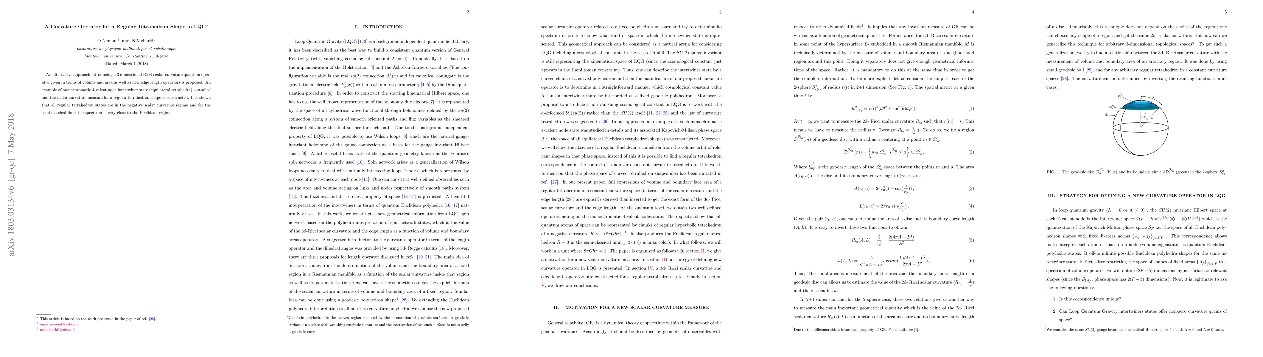An alternative approach introducing a 3 dimensional Ricci scalar curvature quantum operator given in terms of volume and area as well as new edge length operators is proposed. An example of monochromatic 4-valent node intertwiner state (equilateral tetrahedra) is studied and the scalar curvature measure for a regular tetrahedron shape is constructed. It is shown that all regular tetrahedron states are in the negative scalar curvature regime and for the semi-classical limit the spectrum is very close to the Euclidean regime.