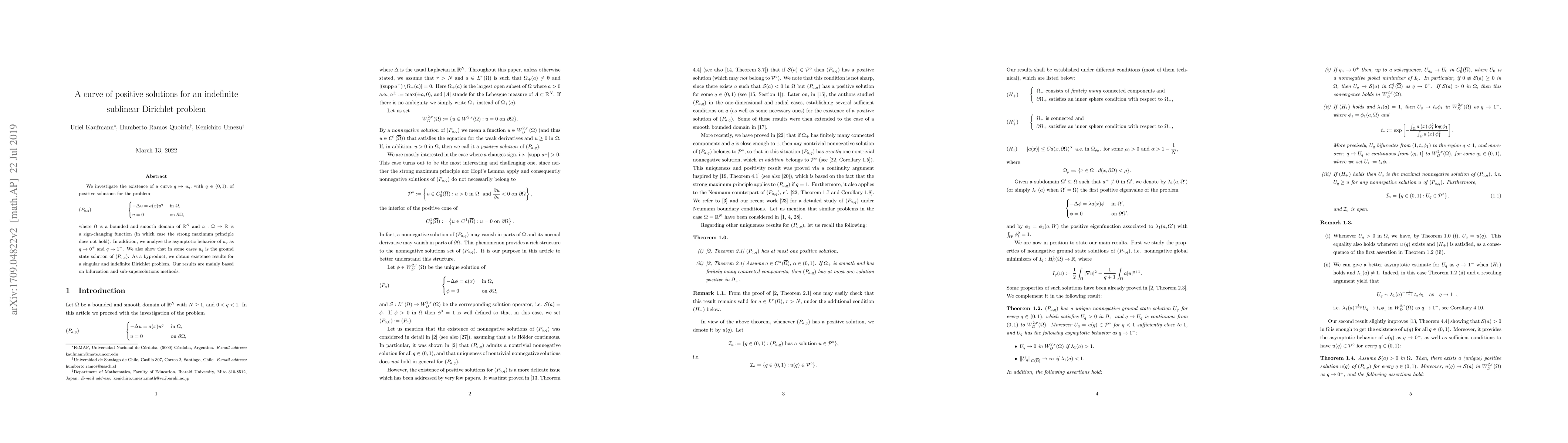 We investigate the existence of a curve $q\mapsto u_{q}$, with $q\in(0,1)$, of positive solutions for the problem $(P_{a,q})$: $-\Delta u=a(x)u^{q}$ in $\Omega$, $u=0$ on $\partial\Omega$, where $\Omega$ is a bounded and smooth domain of $\mathbb{R}^{N}$ and $a:\Omega\rightarrow\mathbb{R}$ is a sign-changing function (in which case the strong maximum principle does not hold). In addition, we analyze the asymptotic behavior of $u_{q}$ as $q\rightarrow0^{+}$ and $q\rightarrow1^{-}$. We also show that in some cases $u_{q}$ is the ground state solution of $(P_{a,q})$. As a byproduct, we obtain existence results for a singular and indefinite Dirichlet problem. Our results are mainly based on bifurcation and sub-supersolutions methods.