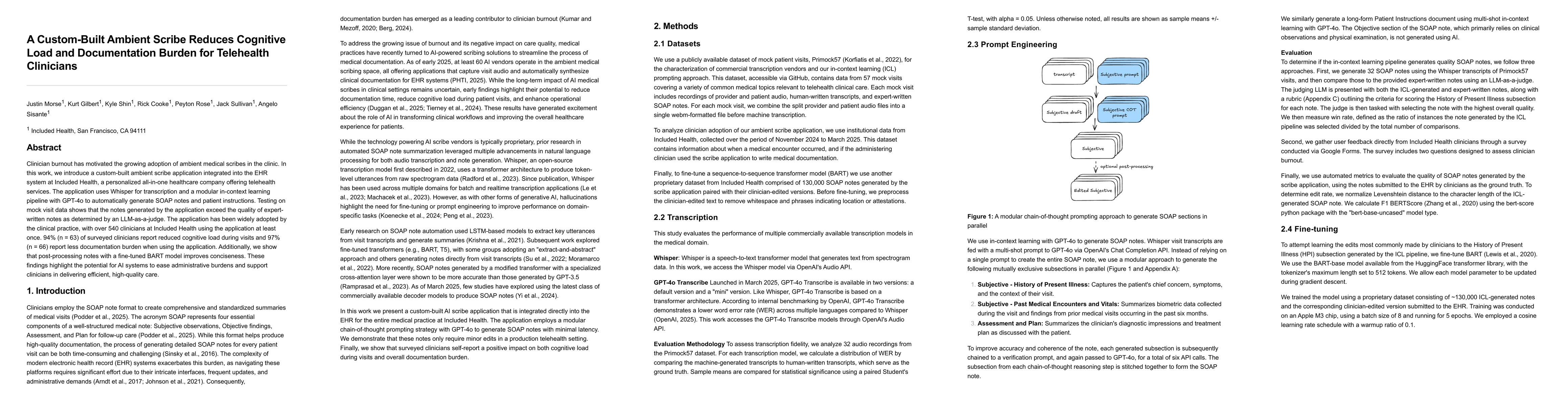 Clinician burnout has motivated the growing adoption of ambient medical scribes in the clinic. In this work, we introduce a custom-built ambient scribe application integrated into the EHR system at Included Health, a personalized all-in-one healthcare company offering telehealth services. The application uses Whisper for transcription and a modular in-context learning pipeline with GPT-4o to automatically generate SOAP notes and patient instructions. Testing on mock visit data shows that the notes generated by the application exceed the quality of expert-written notes as determined by an LLM-as-a-judge. The application has been widely adopted by the clinical practice, with over 540 clinicians at Included Health using the application at least once. 94% (n = 63) of surveyed clinicians report reduced cognitive load during visits and 97% (n = 66) report less documentation burden when using the application. Additionally, we show that post-processing notes with a fine-tuned BART model improves conciseness. These findings highlight the potential for AI systems to ease administrative burdens and support clinicians in delivering efficient, high-quality care.