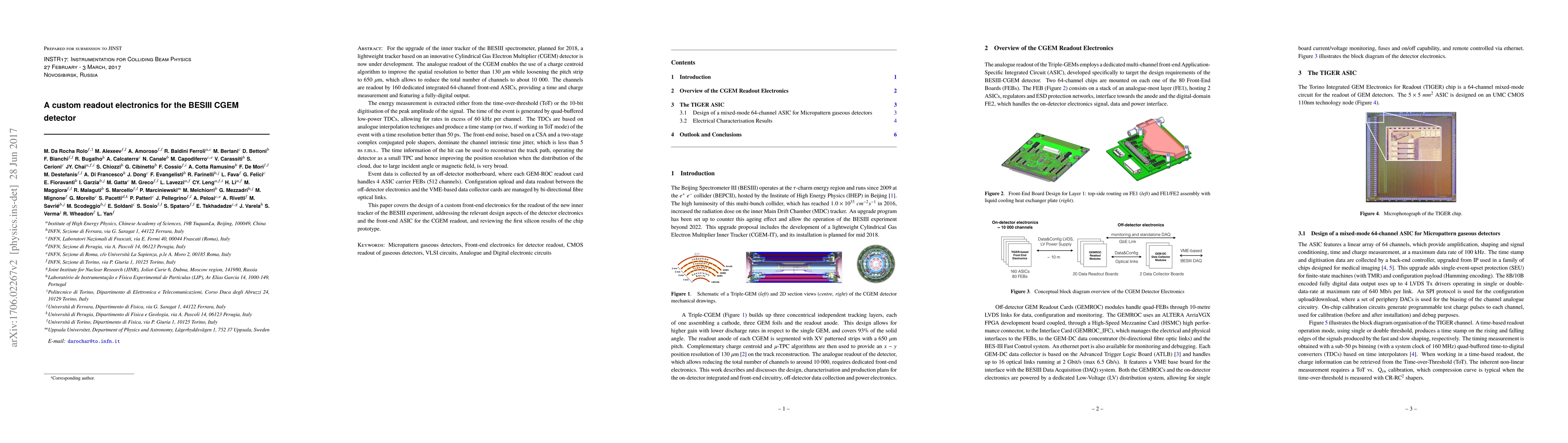 For the upgrade of the inner tracker of the BESIII spectrometer, planned for 2018, a lightweight tracker based on an innovative Cylindrical Gas Electron Multiplier (CGEM) detector is now under development. The analogue readout of the CGEM enables the use of a charge centroid algorithm to improve the spatial resolution to better than 130 um while loosening the pitch strip to 650 um, which allows to reduce the total number of channels to about 10 000. The channels are readout by 160 dedicated integrated 64-channel front-end ASICs, providing a time and charge measurement and featuring a fully-digital output. The energy measurement is extracted either from the time-over-threshold (ToT) or the 10-bit digitisation of the peak amplitude of the signal. The time of the event is generated by quad-buffered low-power TDCs, allowing for rates in excess of 60 kHz per channel. The TDCs are based on analogue interpolation techniques and produce a time stamp (or two, if working in ToT mode) of the event with a time resolution better than 50 ps. The front-end noise, based on a CSA and CR-RC2 shapers, dominate the channel intrinsic time jitter, which is less than 5 ns r.m.s.. The time information of the hit can be used to reconstruct the track path, operating the detector as a small TPC and hence improving the position resolution when the distribution of the cloud, due to large incident angle or magnetic field, is very broad. Event data is collected by an off-detector motherboard, where each GEM-ROC readout card handles 4 ASIC carrier PCBs (512 channels). Configuration upload and data readout between the off-detector electronics and the VME-based data collector cards are managed by bi-directional fibre optical links.