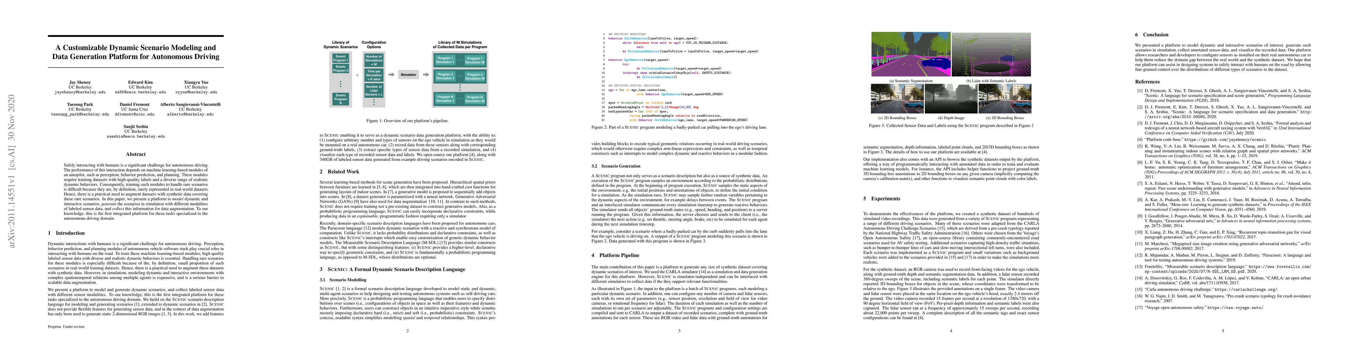 Safely interacting with humans is a significant challenge for autonomous driving. The performance of this interaction depends on machine learning-based modules of an autopilot, such as perception, behavior prediction, and planning. These modules require training datasets with high-quality labels and a diverse range of realistic dynamic behaviors. Consequently, training such modules to handle rare scenarios is difficult because they are, by definition, rarely represented in real-world datasets. Hence, there is a practical need to augment datasets with synthetic data covering these rare scenarios. In this paper, we present a platform to model dynamic and interactive scenarios, generate the scenarios in simulation with different modalities of labeled sensor data, and collect this information for data augmentation. To our knowledge, this is the first integrated platform for these tasks specialized to the autonomous driving domain.