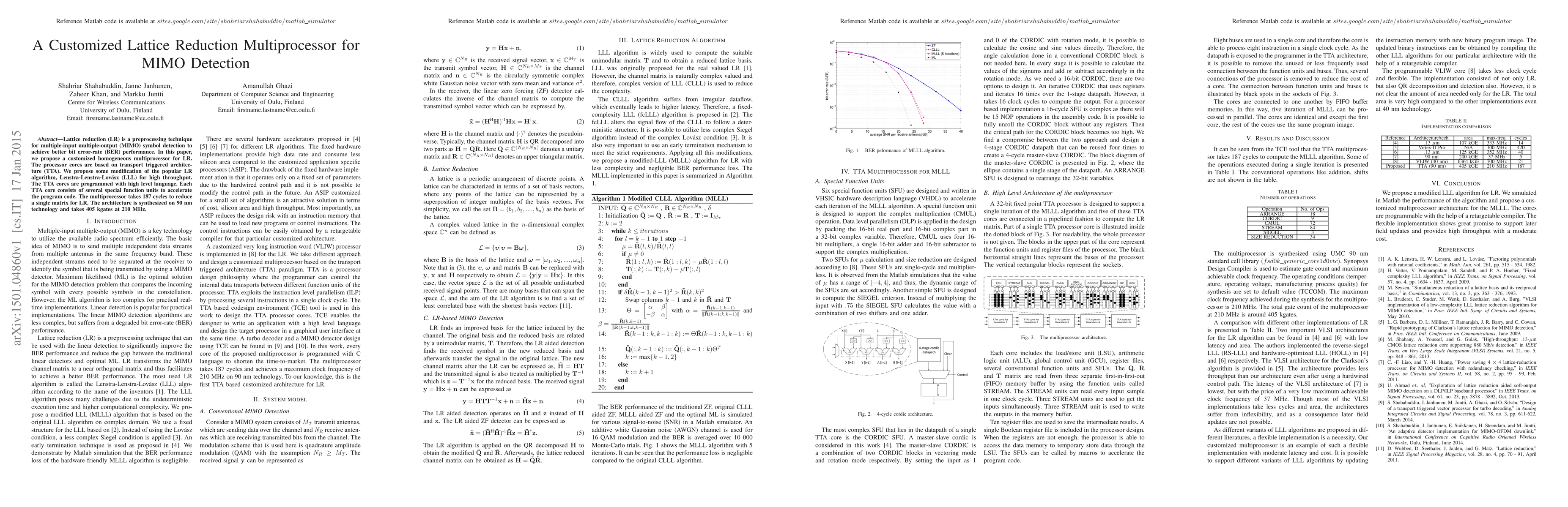 This paper proposes a customized multiprocessor based on transport triggered architecture (TTA) for lattice reduction in MIMO detection, modifying the LLL algorithm for enhanced throughput. The architecture, synthesized on 90 nm technology, reduces a single matrix in 187 cycles and requires 405 kgates at 210 MHz.
