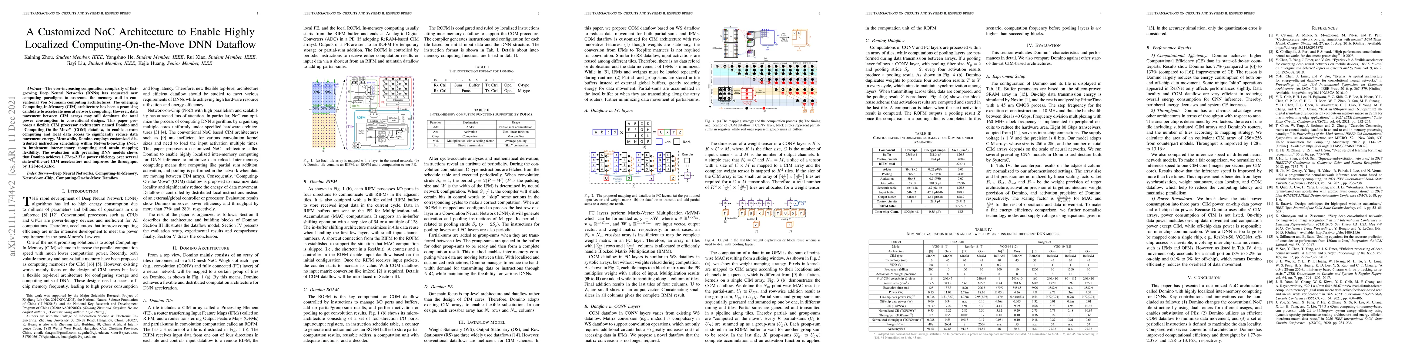This paper introduces Domino, a customized Network-on-Chip (NoC) architecture with "Computing-On-the-Move" (COM) dataflow, designed to enhance localized DNN computation and reduce power consumption by minimizing data movement. Evaluations demonstrate Domino's power efficiency and throughput improvements over existing CIM accelerators.